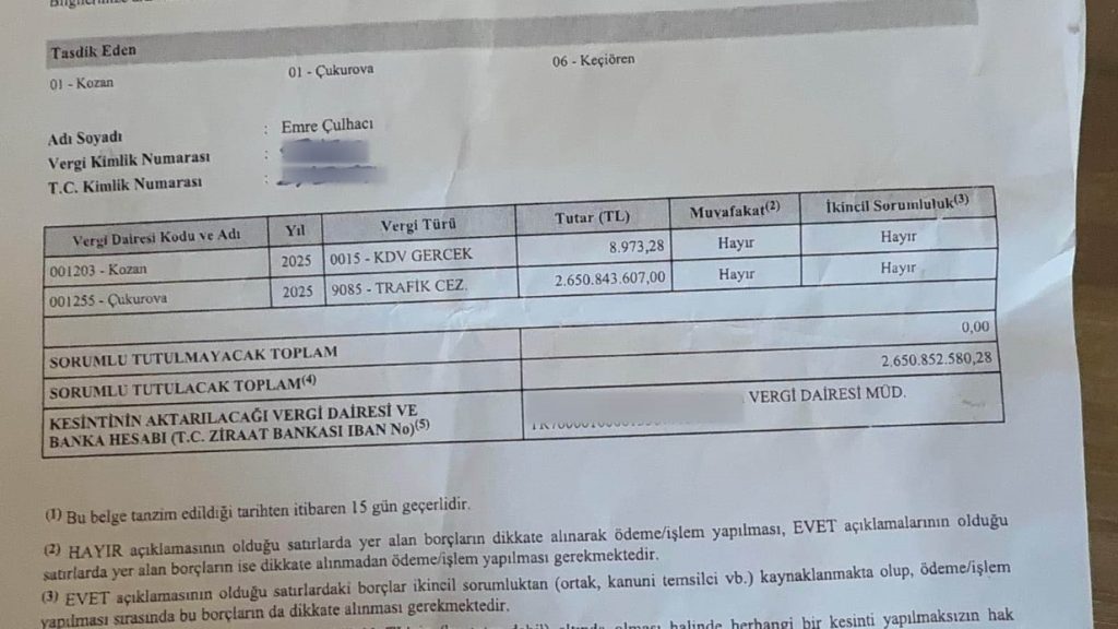 Adana’nın Kozan ilçesinde görev yapan Avukat Emre Çulhacı, kendisine kesilen 2 milyar 650 milyon 843 bin 607 liralık trafik cezasıyla ilgili büyük bir yanılgıya uğradı. Türkiye’deki bir yıllık trafik cezalarının toplamının yaklaşık otuzda biri kadar olan bu miktar, avukatın dikkatini çekti ve hemen araştırma yapmaya koyuldu.