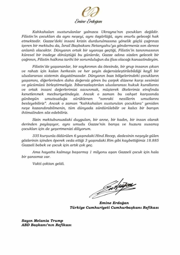 AK Parti Sözcüsü Ömer Çelik, Emine Erdoğan’ın Amerika Birleşik Devletleri Başkanı Donald Trump’ın eşi Melania Trump’a yazdığı mektubu kamuoyu ile paylaştı. Çelik, mektubun tüm dünya insanlarının vicdanına hitap ettiğini vurguladı.