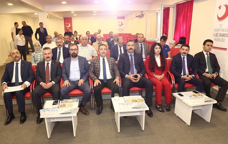 İl Göç Müdürü Mehmet Servet Yelken’in Göç İdaresinin Uyum Straeji Belgesi, Ulusal Eylem Planı kapsamında uygulanan programları hakkında sunumu ile başlayan toplantıda. İl Müdürü Yelken tarafından Aksaray’da kayıtlı yabancı sayıları, misafir göçmen sayıları ile Göç İdaresi Müdürlüğü hizmetleri hakkında bilgi verildi. Yelken. inanç, kültür ve Türk medeniyetinin komşularına ve zorda kalan insanlara yardım etmeyi her zaman öncelikli görev olarak gördüğünü, komşu ülkelerden ve çeşitli dünya ülkelerinden Türkiye’ye sığınan, Aksaray’da ikamet eden yabancıların 6458 sayılı Yabancılar ve Uluslararası Koruma Kanunu çerçevesinde iş ve işlemlerini en iyi şekilde yürütmeye çalıştıklarını söyledi.