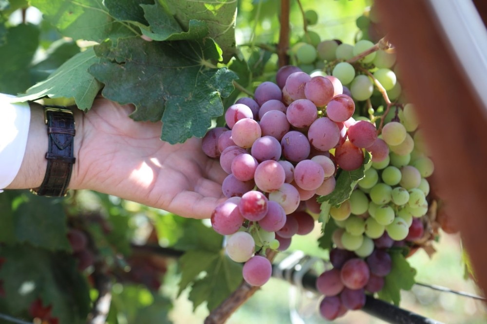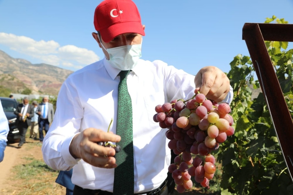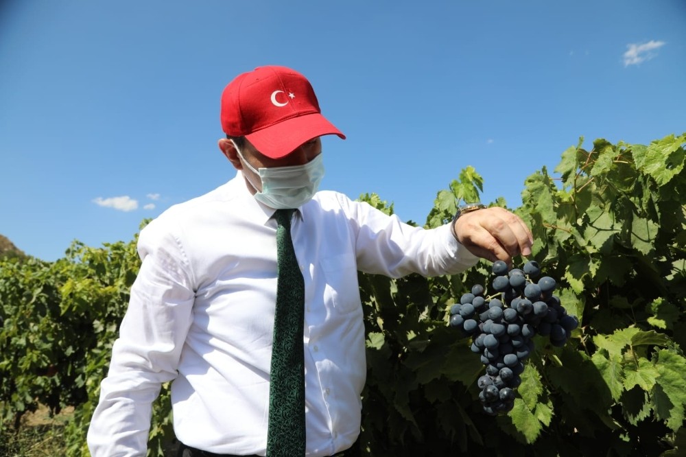 Kaymakamlık ziyareti sonrasında Yukarıkale mahallesine giderek 40 dönümlük bir üzüm bağına giren Vali Salih Ayhan, önce üreticiden bilgi aldı, sonrasında eline makası alarak üzüm salkımlarını teker teker kesti ve kovalara doldurdu.