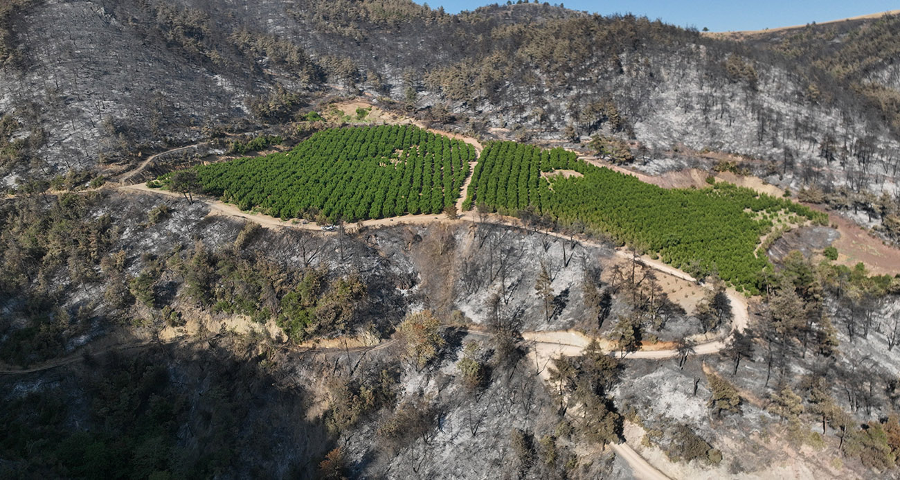 Yangın sonrası hayatın normale dönmesiyle, Karahıdır Mahallesi’nde yer alan Halil Kiraz’a ait 25 dönümlük bahçe, çevresi küle dönmüşken yeşil kalmasıyla dikkat çekti. Çevresi gri tabakayla kaplı toprakların ortasında duran bu bahçe, insanlara umut aşıladı.