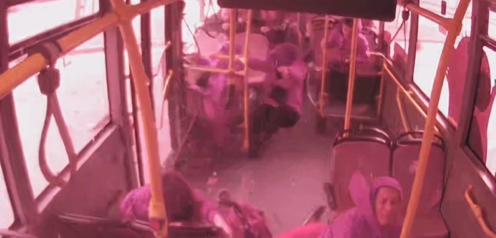 Kaza, otobüs içi ve dışındaki güvenlik kameraları tarafından kaydedildi. Görüntülerde, fren sesinin ardından otobüsün hızlanması ve şoförün yokuş aşağı inişte önce park halindeki araca çarparak hızını kesmeye çalıştığı, daha sonra direğe çarptığı görülüyor. Çarpışma sonucunda otobüs içerisinde bulunan yolcuların sert bir şekilde savrulduğu ve çığlıklar attığı dikkat çekiyor. Olay yerindeki diyaloglarda, yaralanan şoförün yolculara sağlık durumlarını sorarak yardım etmeye çalıştığı duyuluyor.