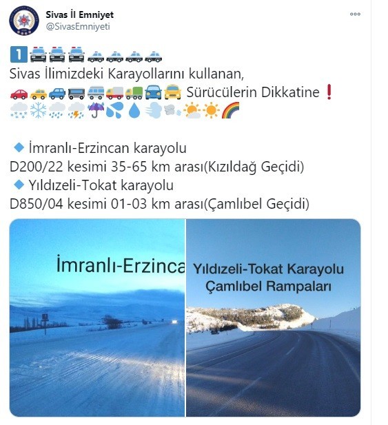 Sivas’ta beklenen karın yağması ile birlikte başlayan soğuk havadan dolayı yolların buz tutması Sivas İl Emniyet Müdürlüğü ekiplerini harekete geçirdi. İl Emniyet Müdürlüğü’nün sosyal medya hesaplarından yaptığı duyuru ile Sivaslı sürücüler uyarılarak özellikle Kızıldağ geçidi, Çamlıbel geçidi ile Gürün-Pınarbaşı ve Kangal-Malatya karayollarında buzlanmadan dolayı dikkatli araç kullanmalarını istedi. Ayrıca yapılan duyuru ile yola çıkacak sürücülerin de mutlaka yanlarına gerekli ekipmanları alarak trafiğe çıkmalarının altı çizildi.
