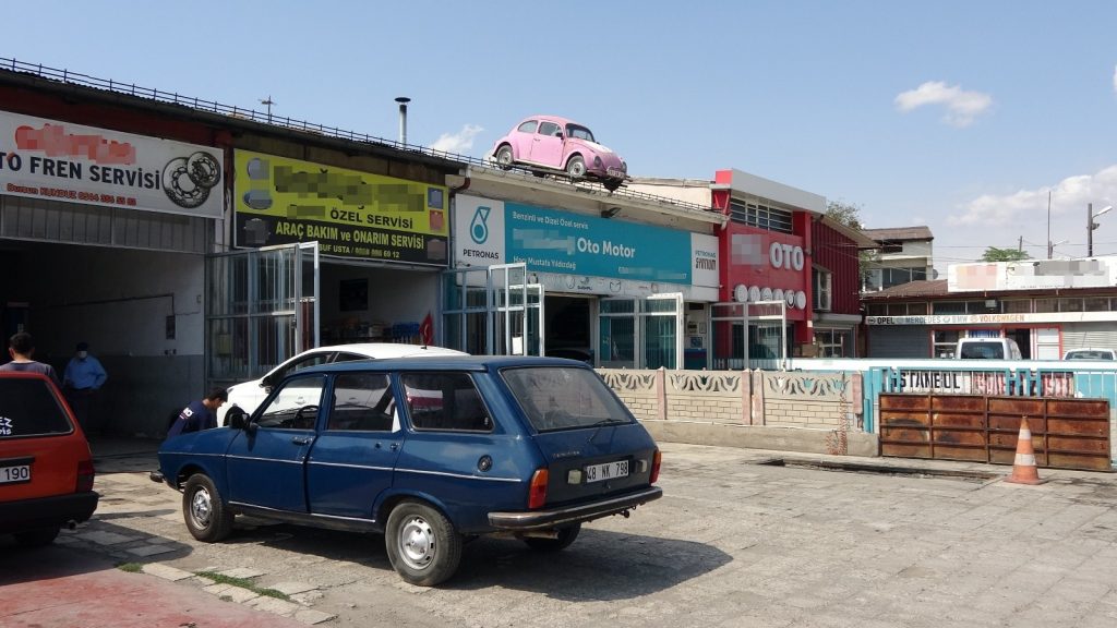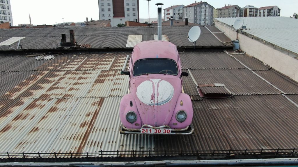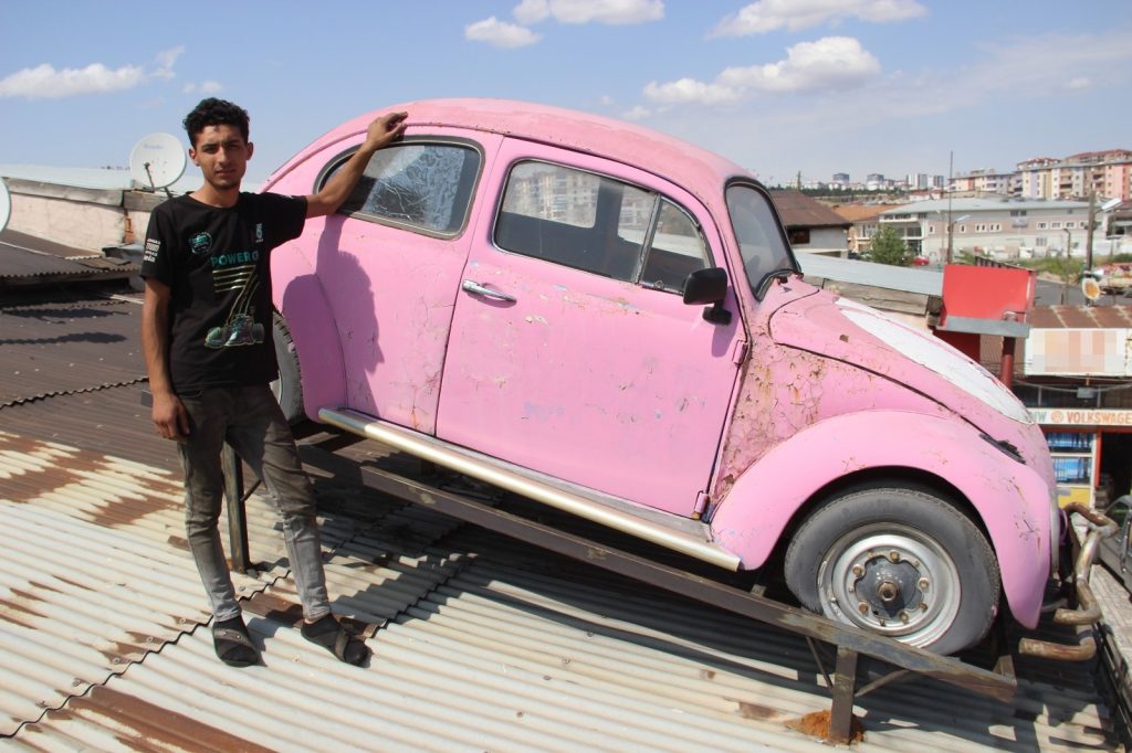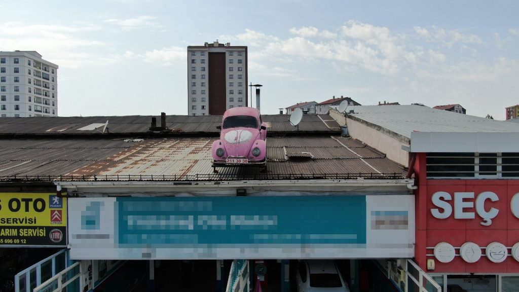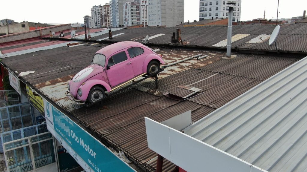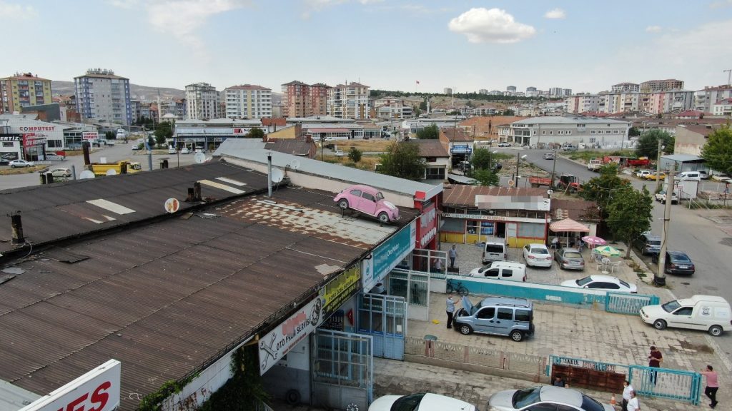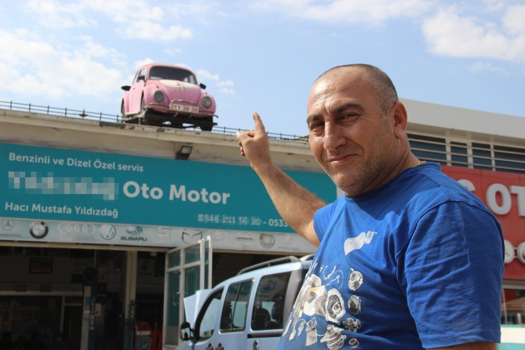 Sivas oto sanayinde bir iş yerinin çatısında bulunan ‘tosba’ araba sayesinde oto mekaniker ustası iş yerinin yerini kolayca tarif edebiliyor.