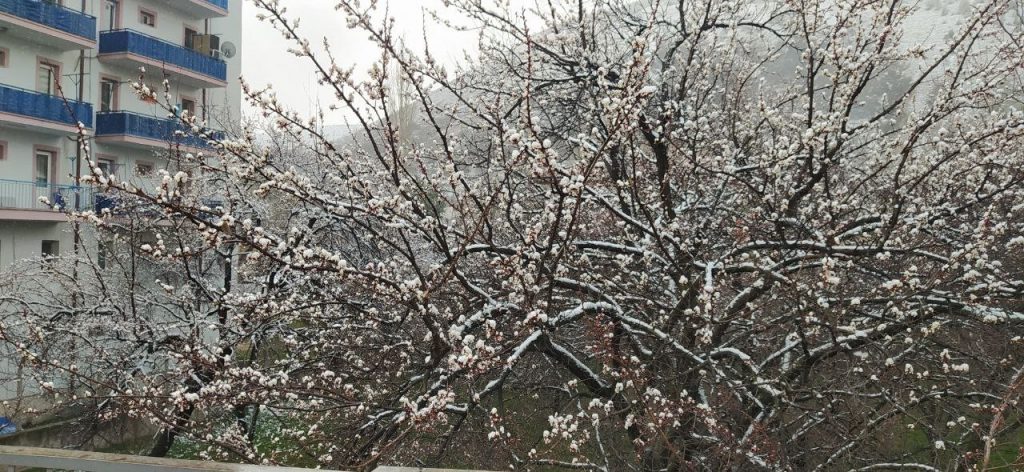 Çiçek açan meyve ağaçlarının üzerine kar yağdı