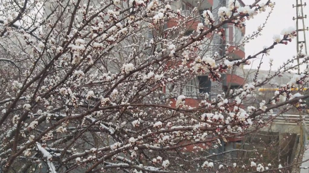 Bahar aylarının gelmesine rağmen Sivas’ta etkili olan kar yağışı çiçek açmaya başlayan kayısı ağaçlarını beyaza bürüyünce çiftçiler tedirgin oldu.