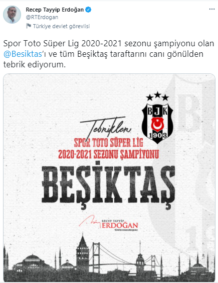 Cumhurbaşkanı Erdoğan, sosyal medya hesabından yaptığı paylaşımda, “Spor Toto Süper Lig 2020-2021 sezonu şampiyonu olan Beşiktaş’ı ve tüm Beşiktaş taraftarını canı gönülden tebrik ediyorum.” ifadesini kullandı.