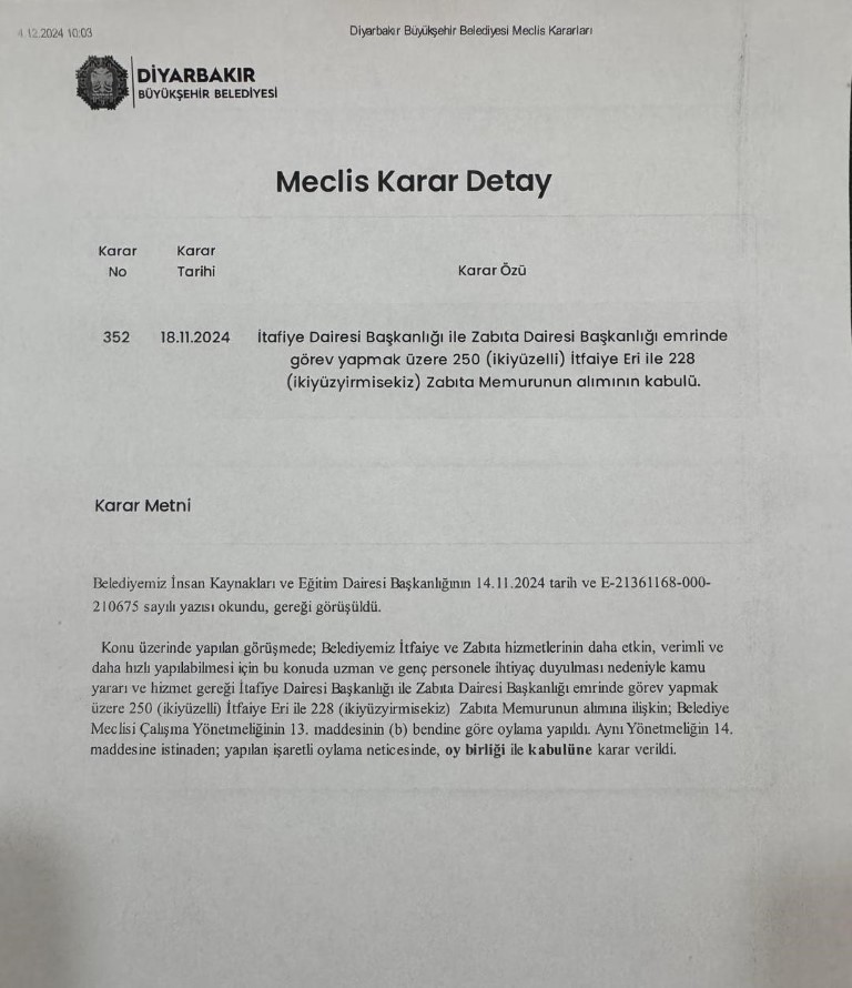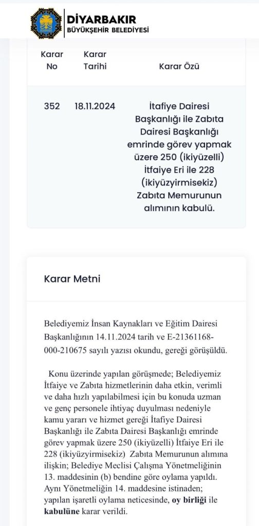 Diyarbakır Büyükşehir Belediye Başkanı Ayşe Serra Bucak Küçük’ün onayıyla, Belediye İnsan Kaynakları ve Eğitim Dairesi Başkanlığı tarafından sözleşmeli memurlara gönderilen yazıda, 5393 Sayılı Belediye Kanunu’nun 49. maddesi gereği sözleşmeli personel ihtiyacının mevcut personel sayısını aştığı ve hizmet sözleşmesinin bitiş tarihi olan 31.12.2024’ten sonra sözleşmelerin yenilenmeyeceği bildirildi.