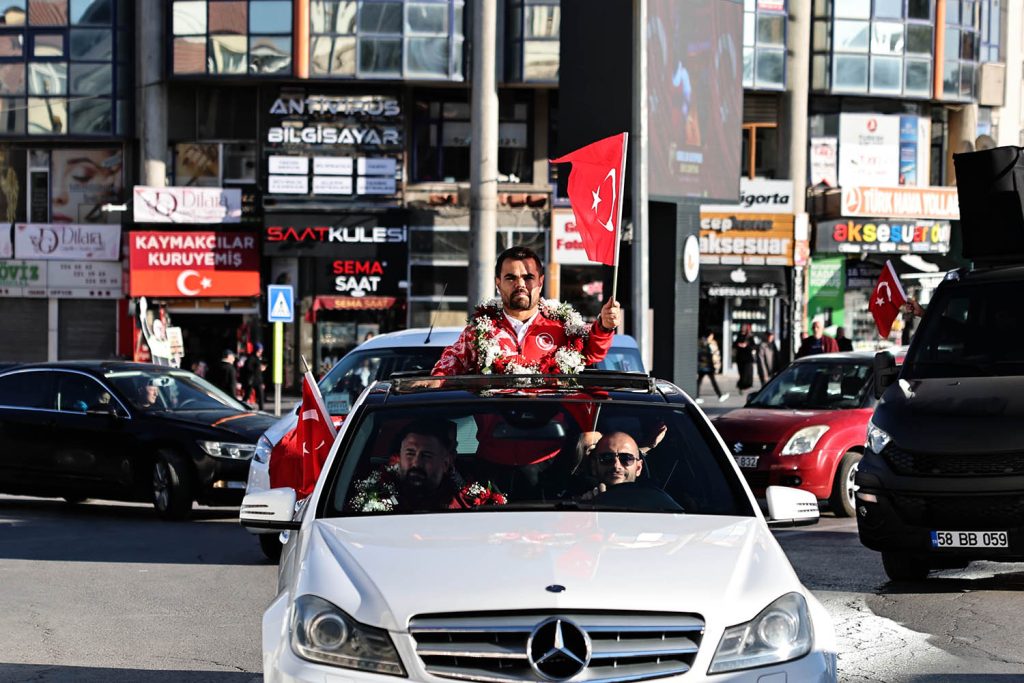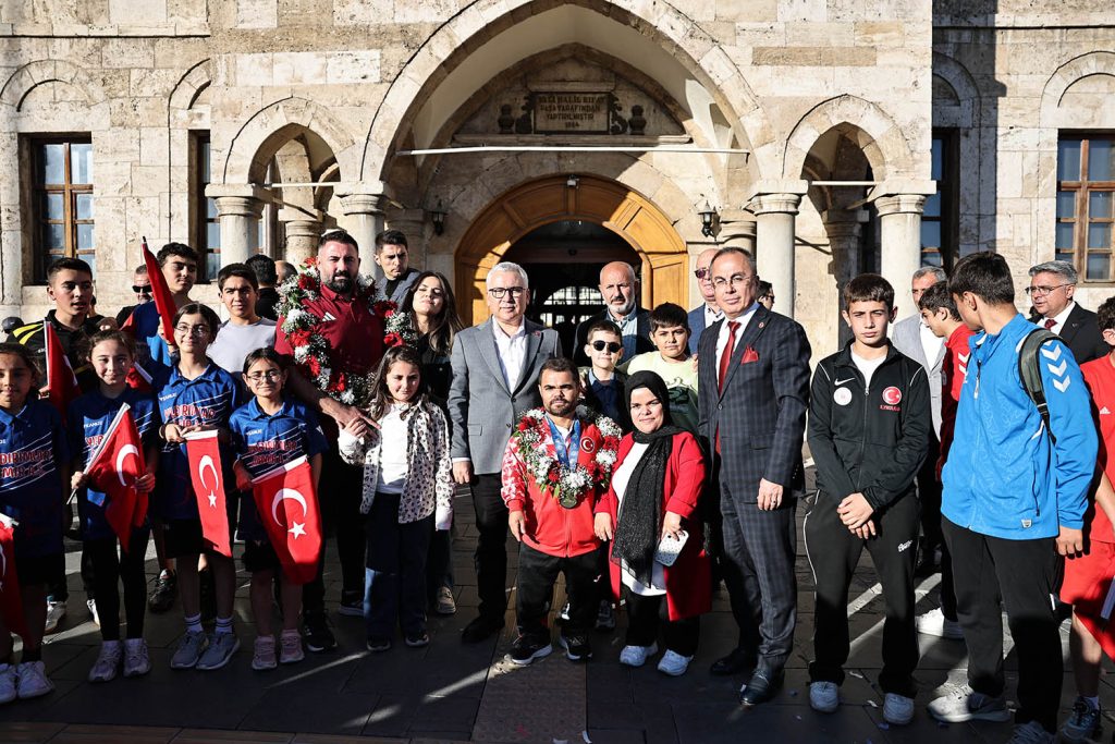 Konvoy eşliğinde Sivas Valiliği’ne gelen dünya şampiyonu Kayapınar, Vali Yılmaz Şimşek tarafından karşılandı.