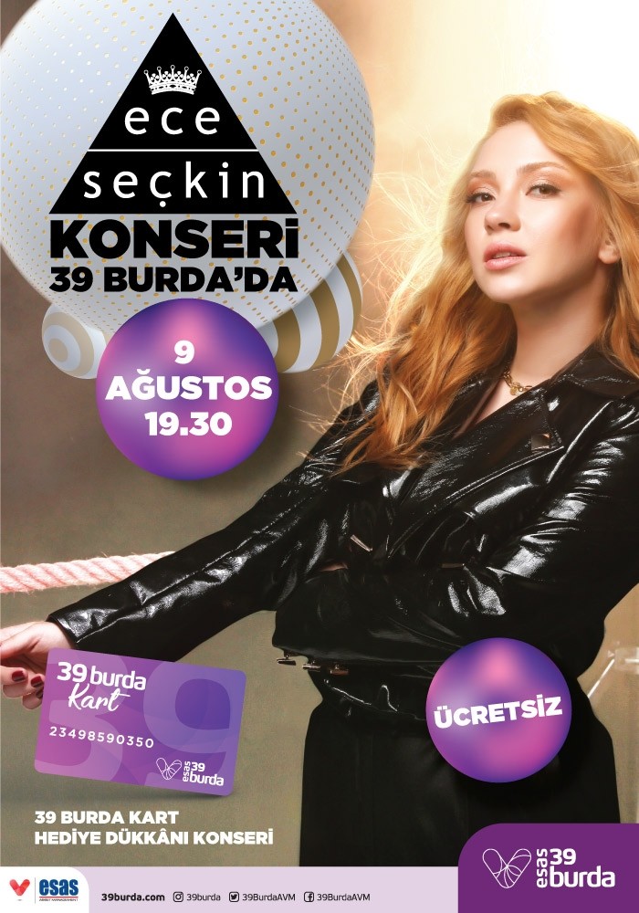 Ece Seçkin hayranlarını buluşturacak konser etkinliği ile geceye eğlence katacak 39Burda AVM, aynı zamanda hediye dükkânı 39Burda Kart uygulamasını da başlatarak ziyaretçilerine alışverişlerinde yüzlerce hediye kazanma fırsatı sunacak.
