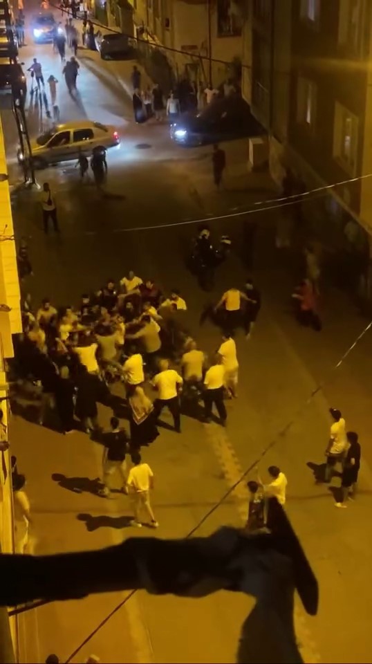 Bu sırada ortamın gerilimi artınca çevre sakinleri durumu polise bildirdi. Olay yerine gelen motosikletli polis ekipleri, tarafları sakinleştirmeye çalıştı ancak kısa sürede kargaşa büyüdü. Bir kişi, polis motosikletinde bulunan kaskı alarak komşusuna vurdu. Çıkan arbede, cep telefonu kamerasına yansıdı ve sokak adeta savaş alanına döndü.