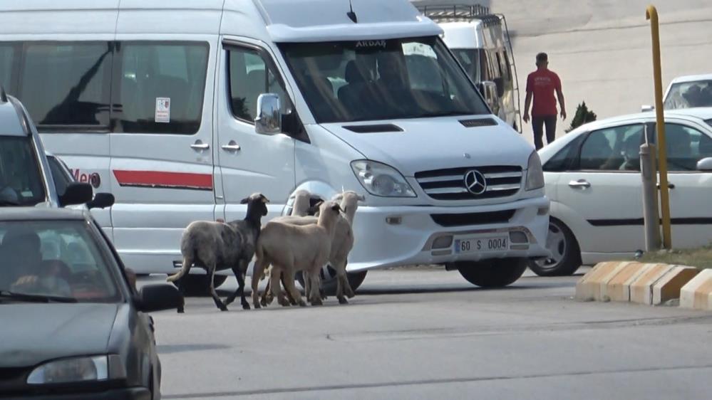 Kurbanlık koçlardan 5 tanesi Yeşilırmak kenarından ilerleyerek ana yola çıktı. Otomobillerin önüne çıkan koçlar trafiğe birbirine kattı. Başıboş şekilde koşarak ilerleyen koçları fark eden iki vatandaş önlerini keserek yakalamaya çalıştı.