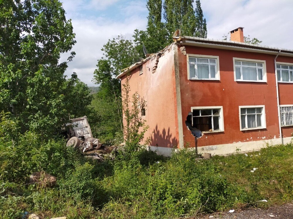 Koyulhisar’da bulunan 3 köprülü kavşakta meydana gelen kazada sürücü S.A., kamyonun freni patlaması sonucu kontrolü kaybetti ve kamyonla birlikte 2 katlı bir evin çatısına uçtu. Tomrukların etrafa saçıldığı kazada sürücünün iki bacağının da kırıldığı öğrenildi. 2 katlı evde o an için kimsenin bulunmaması ise büyük bir facianın eşiğinden dönülmesini sağladı.