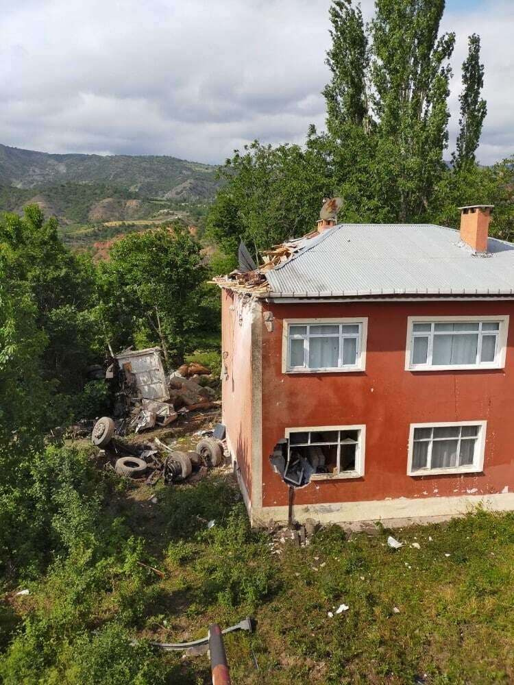 Dün gece geç saatlerde Koyulhisar ilçesinde içinde tomruk yüklü bir kamyon freni patlaması sonucu evin çatısına uçtu.