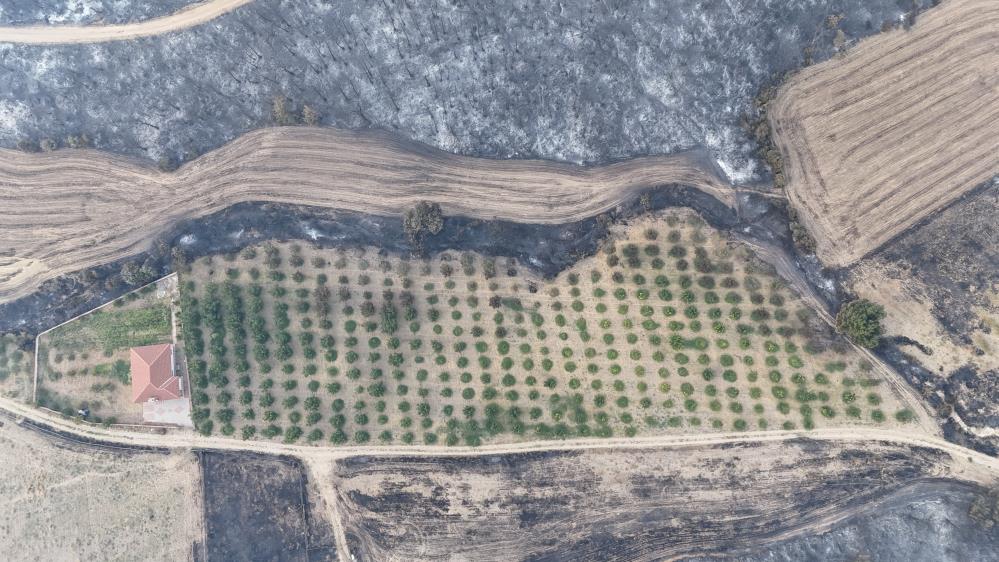 Çanakkale’nin Gelibolu ilçesinde yaşanan büyük orman yangınında, bir çiftçinin önceden aldığı önlemler sayesinde ceviz bahçesi, alevlerden zarar görmeden kurtuldu. Bölgede kül olan alanların arasında yemyeşil kalan bu bahçe, havadan çekilen görüntülerle dikkat çekti.