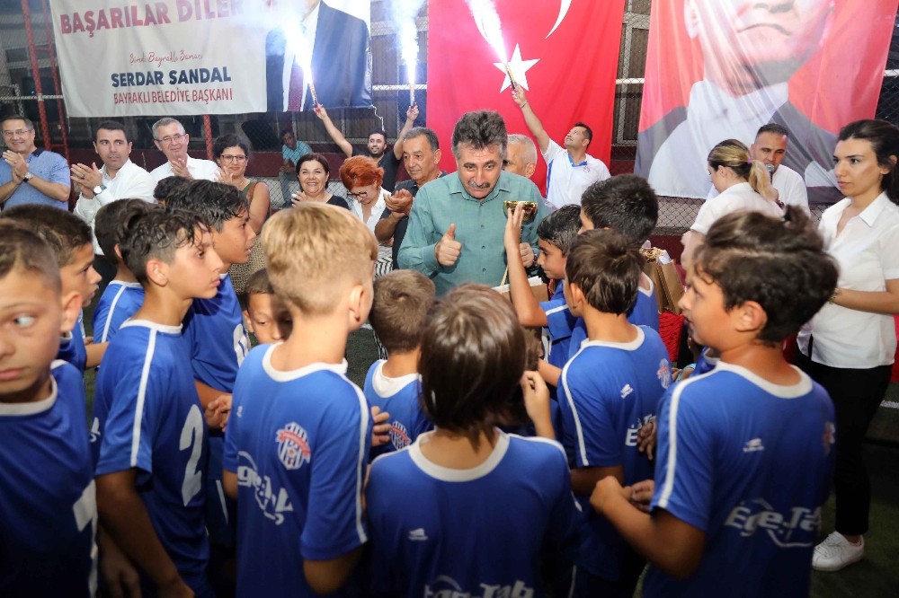 Kupa töreninde konuşan Bayraklı Belediye Başkanı Serdar Sandal, “Turnuvaya katılan bütün takımlarımızı kutluyorum, kulüplerimizi kutluyorum, hocalarını kutluyorum, ailelerini kutluyorum, hakemlerimize emeklerinden dolayı şükranlarımı sunuyorum. Çok güzel bir turnuva oldu. Aslında bu turnuvanın kazananı kaybedeni yok. Önümüzdeki süreçlerde bunu biraz daha büyüterek daha güçlü daha güzel turnuvalarda inşallah hep beraber oluruz. Katıldığınız için hepinize çok teşekkür ediyorum. Sağ olun var olun” dedi. Dereceye giren futbolculara ödüllerini CHP Bayraklı İlçe Başkanı Cemalettin Alper ve belediye meclis üyeleri verirken, şampiyon Pınargücü ise, kupasını Başkan Serdar Sandal’ın elinden aldı.