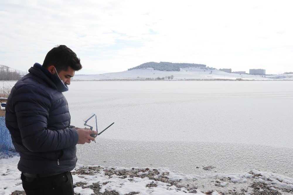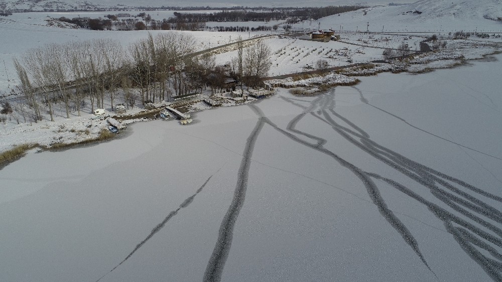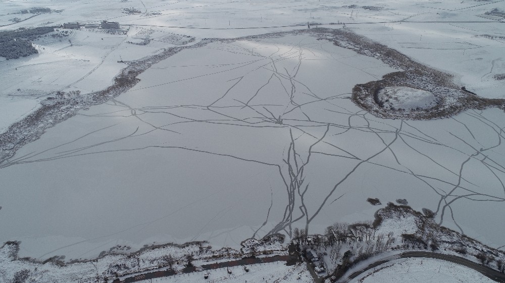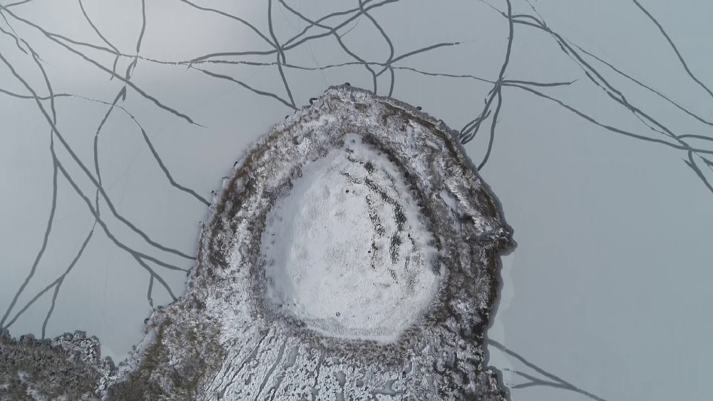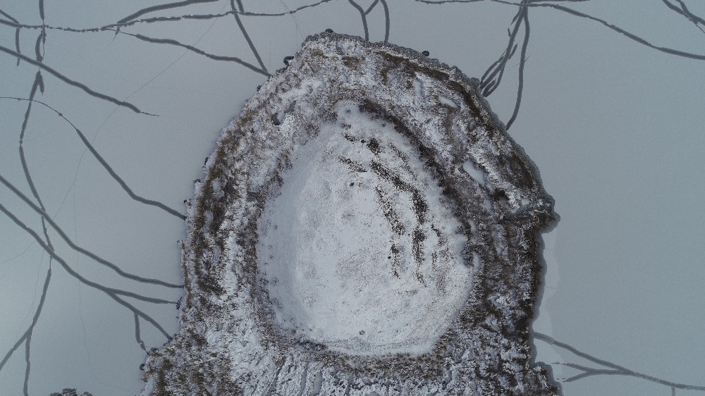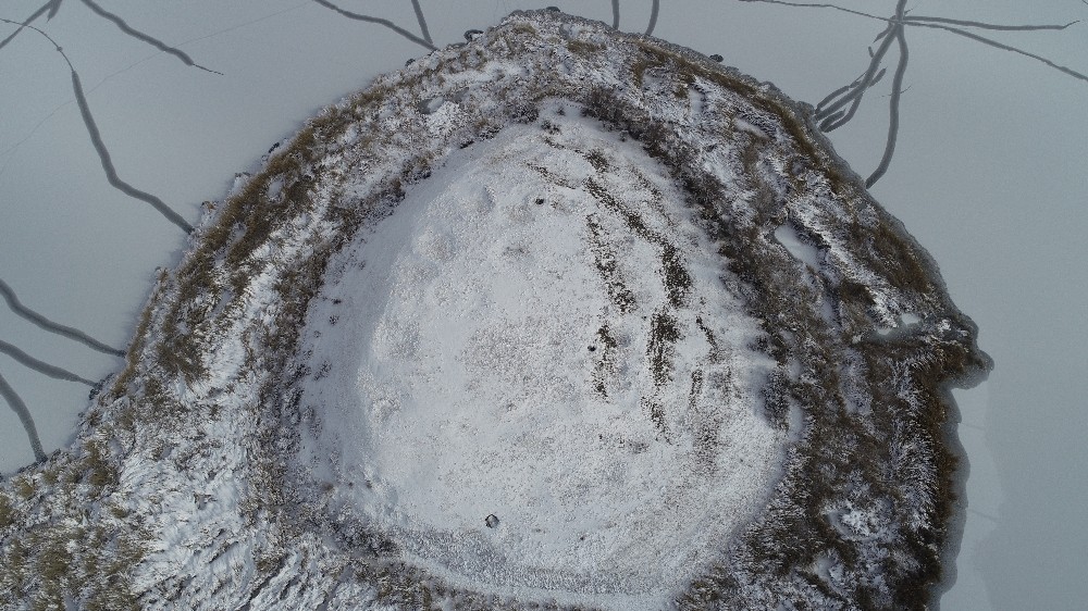 Sivas’ın göllerinden Hafik Gölü buz gibi hava soğukluğu ile birlikte donarken, gölde bulunan Pılır höyüğünün karla kaplı görüntüsü gökyüzünden görüntülendi.