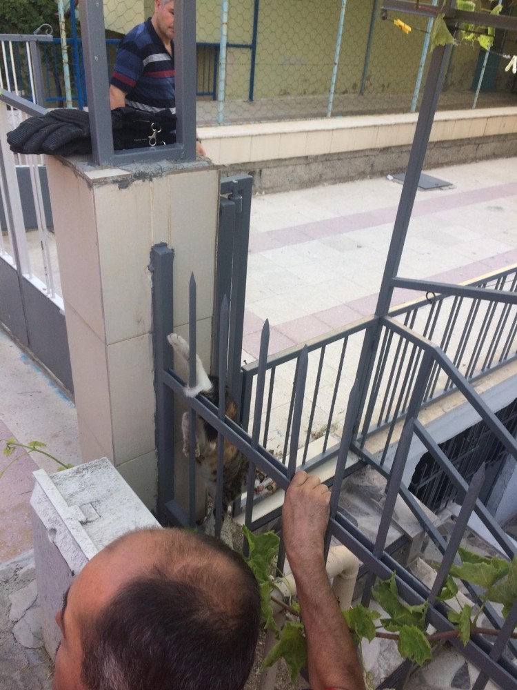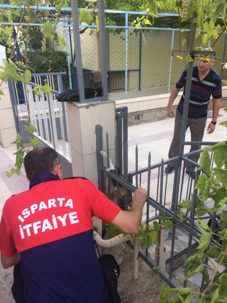 Isparta’da demir korkuluklara saplanan kediyi itfaiye kurtardı
