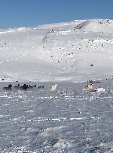 Kangal’ın Aktepe ve Taşlı köyleri arasında kar nedeniyle kapanan yolları açma çabası içinde olan ekipler, iş makinesi kullanan 36 yaşındaki Adem Yıldırım tarafından fark edilen bir at sürüsüne rastladı. Yıldırım, bu büyüleyici anı cep telefonuyla kaydederek ölümsüzleştirdi. Koşan atlar, kısa bir süre sonra gözden kayboldu.