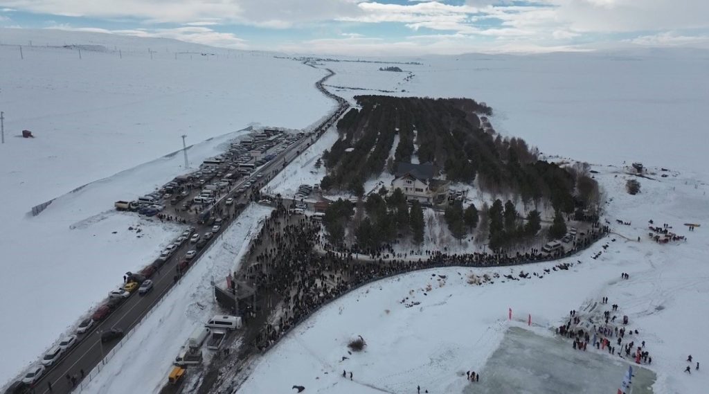 Bölgeye ulaşım sağlamakta güçlük çeken ziyaretçiler, karlı ovalar arasında uzanan yollarda uzun süreler trafikte kaldı. Buzla kaplı göl üzerinde düzenlenen etkinlikler ise, drone kameralarına yansıyan görüntülerle izleyenlere ulaştı.