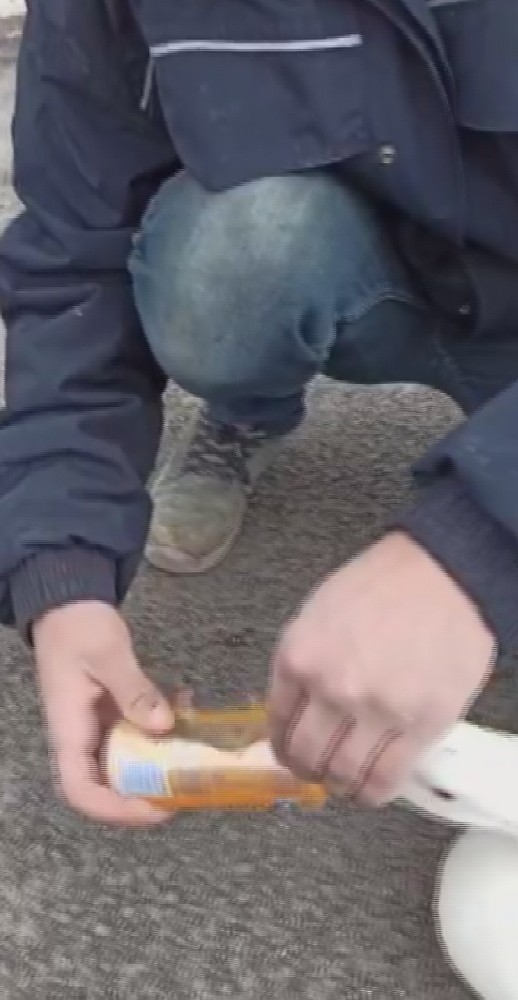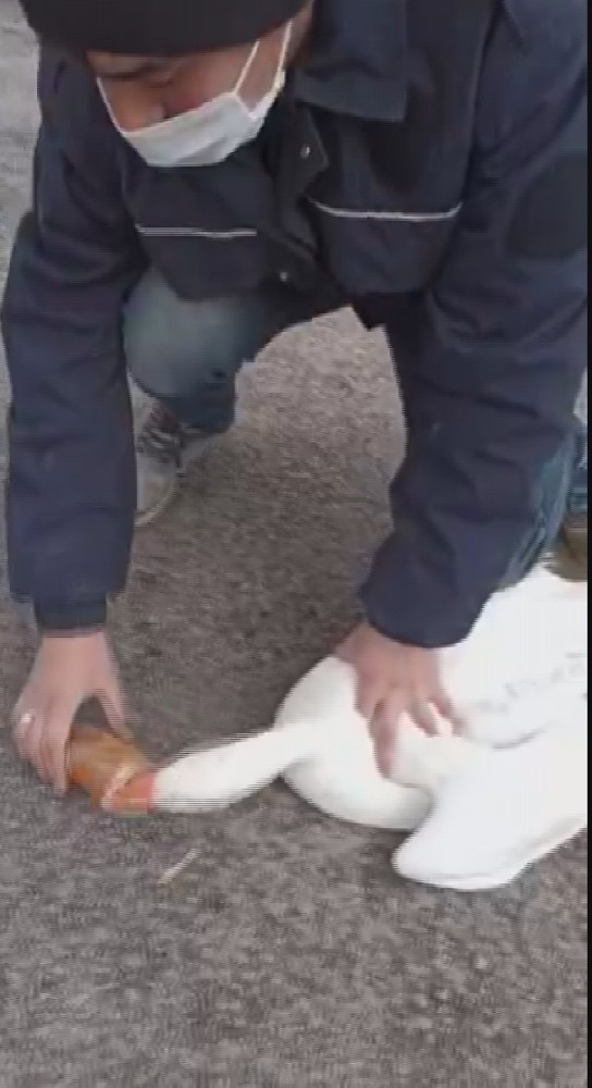 Durumu çevrede bulunan iki vatandaş fark etti ve hemen kaza yardım etmek için müdahalede bulundu. Kazın canını daha fazla yakmamak için dikkatli hamlelerle gagadaki kutuyu çıkarıp kazı kurtaran Ahmet Dabak ve Mücahit Karasubaşı’nın kazı kurtarma anları sosyal medyada büyük beğeni topladı.