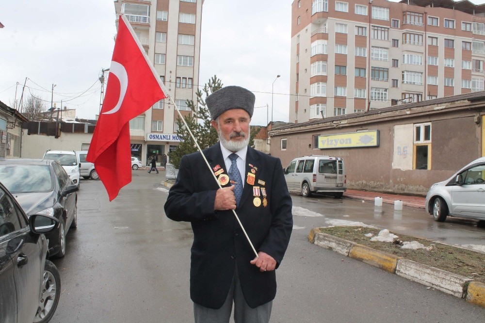 Oğlunun şu anda Suriye’de görev yaptığını söyleyen Veyis Kalkan, kendi oğluna ve cephedeki Mehmetçiklere hitaben “Benim uğrunda gazi olduğum topraklarımıza ölümüne sahip çıkın, ben de cephede savaşmaya hazırım” şeklinde konuştu. Gazi üniformasını giyerek madalyalarını ceketine takan ve elinde Türk bayrağıyla Sivas sokaklarında dolaşan Veyis Kalkan, sınırın ötesinde görev yapan askerlere moral verdi.