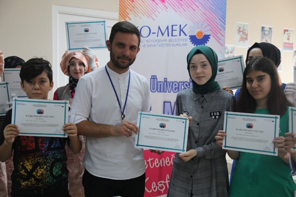Kocaeli Büyükşehir Belediyesi Meslek ve Sanat Eğitim Kursları’nın(KOMEK) yaz günlerinde, 12-22 yaş arasındaki gençlerin sosyal ve kültürel gelişimine katkı sunmak amacıyla projelendirdiği Ev Becerileri Atölyesi faaliyetlerini tamamladı. Gençler, kendi elleriyle yaptıkları pasta ile Ev Becerileri Atölyesi için final programı düzenledi. Aynı programda atölyenin, Temel Mutfak Bilgileri, Temel Dikiş Teknikleri, Basit Onarımlar ve seçmeli branşlarını başarıyla tamamlayan kursiyerlerine sertifikaları verildi. KOMEK gençlerin bu eğitimi günlük hayatlarında kullanabilmeleri amacıyla altı ayrı branş belirledi. Ücretsiz olarak faaliyetlerin yürütüldüğü toplamda 5 hafta süren atölyelerde, Temel Mutfak Bilgileri, Temel Dikiş Teknikleri alanları zorunlu olmak üzere seçmeli olarak belirlenen Pratik Yabancı Dil, Müzik, Resim ve Drama branşlarında paket eğitimler verildi.
