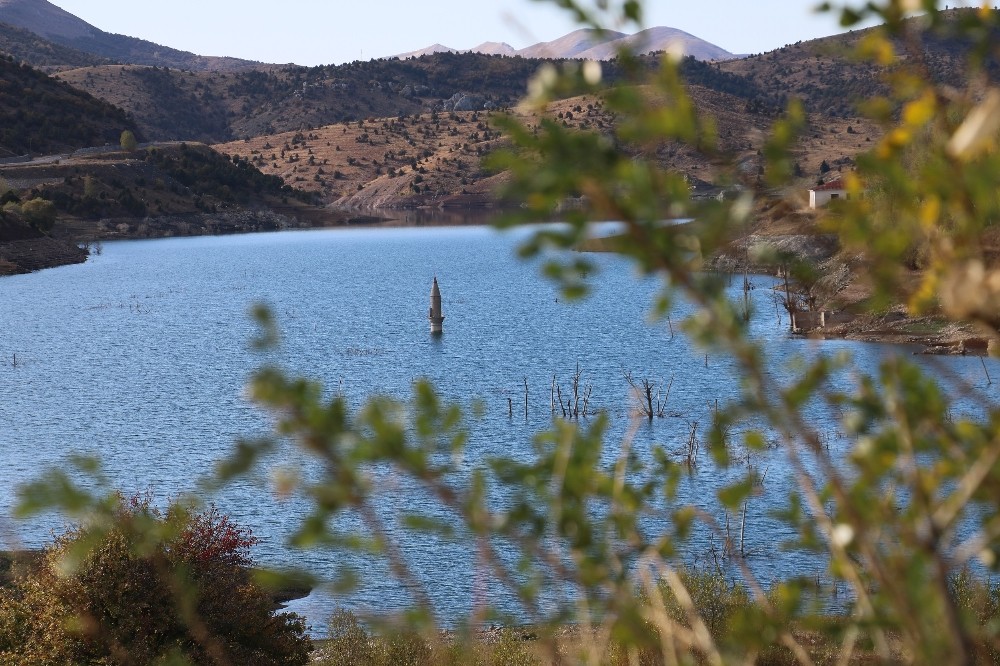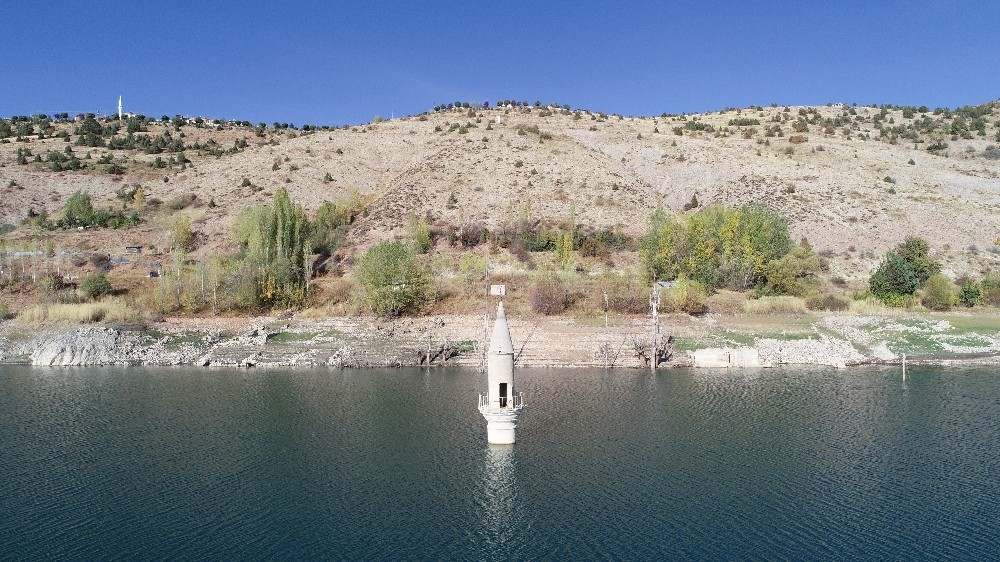 Sivas’ın Hafik ilçesinde yıllar önce baraj suları altında kalan Pusat camisinin minaresi, yıllar içinde yaşanan kuraklığı da kanıtlar nitelikte görüntüler ortaya koyuyor.