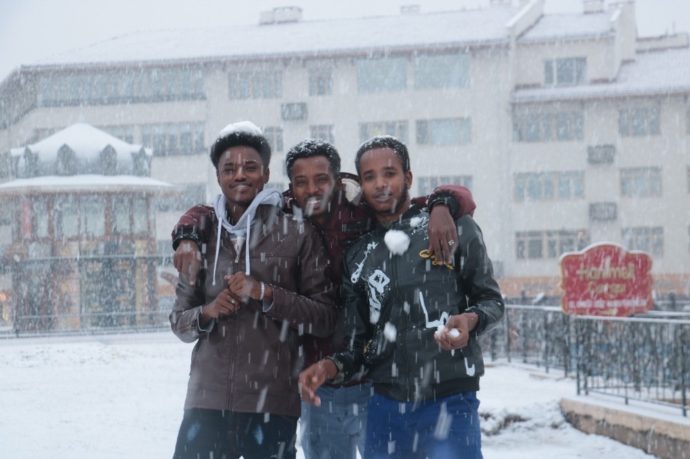 Sivas genelinde özellikle öğle saatlerinden sonra etkili olan kar yağışı ile birlikte kent bembeyaz bir hal alırken karın keyfini en fazla Sivas’ta bulunan Afrika’lı öğrenciler çıkardı.
