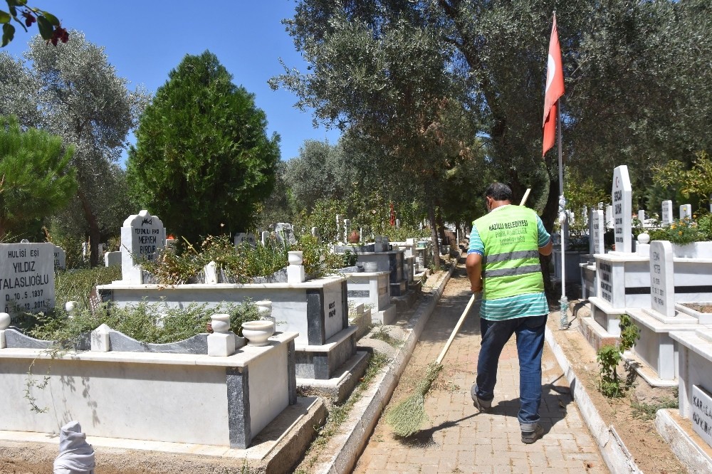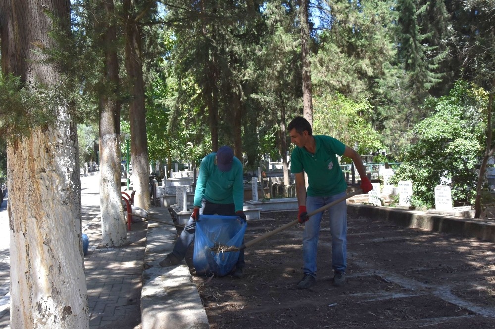 Nazilli Belediyesi Park Bahçe Müdürlüğü ekipleri yaklaşan Kurban Bayramı öncesi mezarlık, refüj ve parklarda temizlik çalışmalarına başladı.