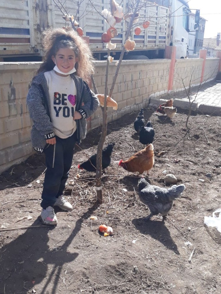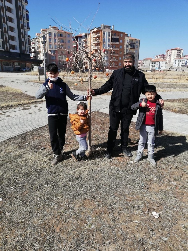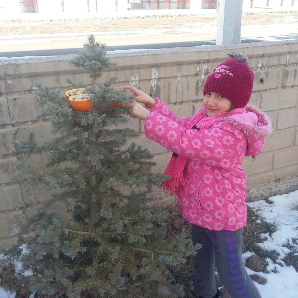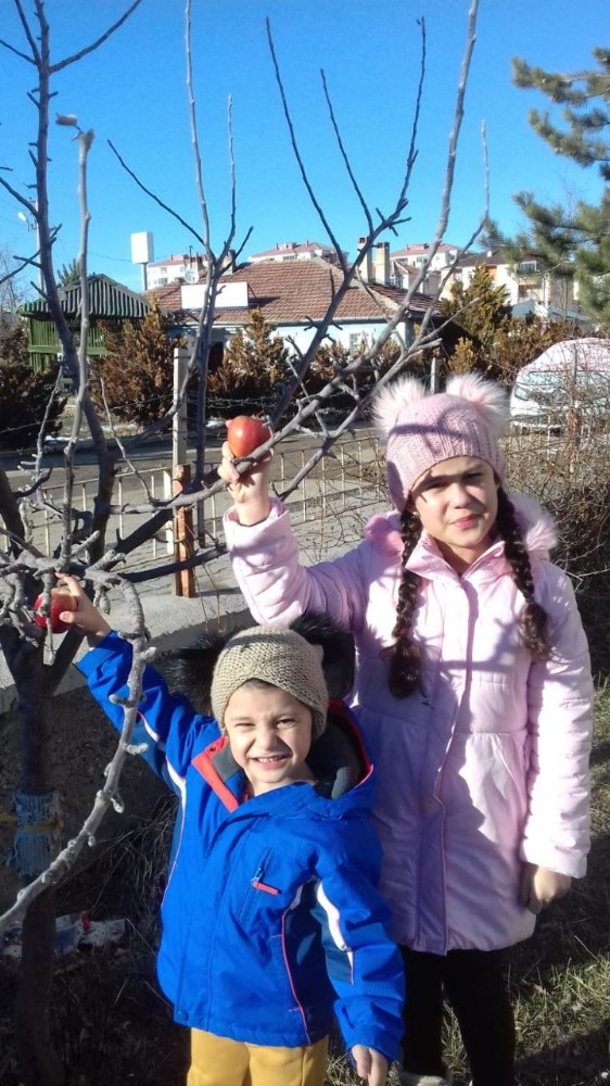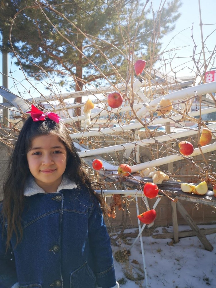 Sivas’ta devam eden soğuk hava nedeniyle kuşların aç kalma ihtimaline karşı ilkokul öğrencileri ağaçlara meyve astı.