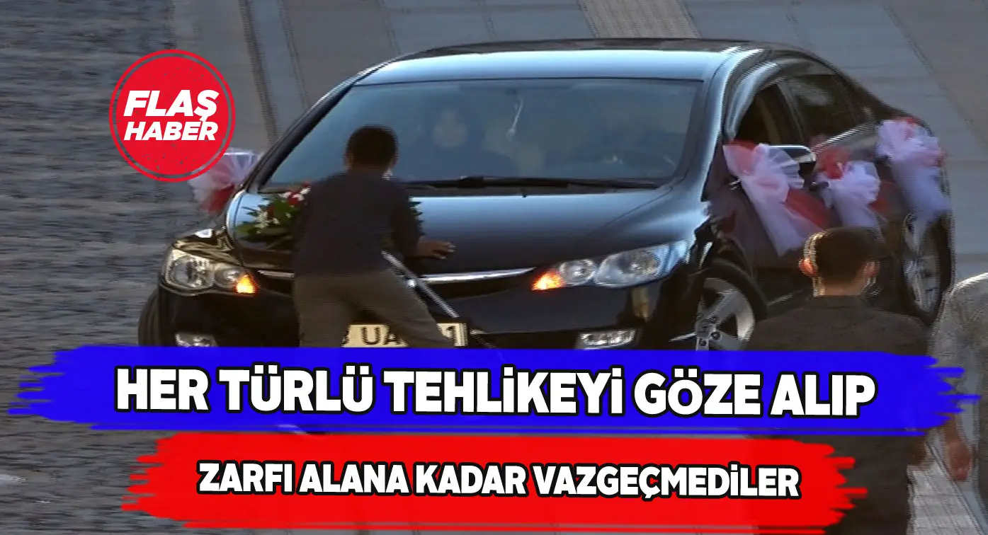 Ufak bir bahşiş almak için gelin arabasının önünü kesen iki genç, araçtan kendilerine zarf verilmemesi üzerine uzun süre direndi. Araç şoförü her ne kadar çocuklara zarf vermeyeceği şekilde ısrarla telkinde bulunsa da bunu dinlemeyen gençler, aracın hareket etmesine rağmen önünden çekilmedi. Hayatlarını tehlikeye atan çocuklara direnemeyen şoför en sonunda havaya içinde para dolu zarflar attı.
