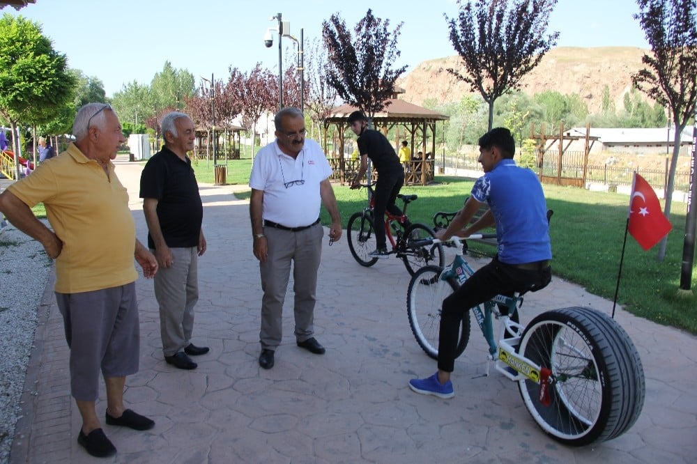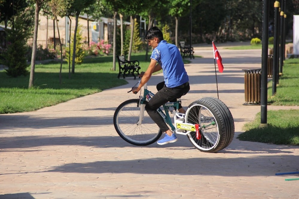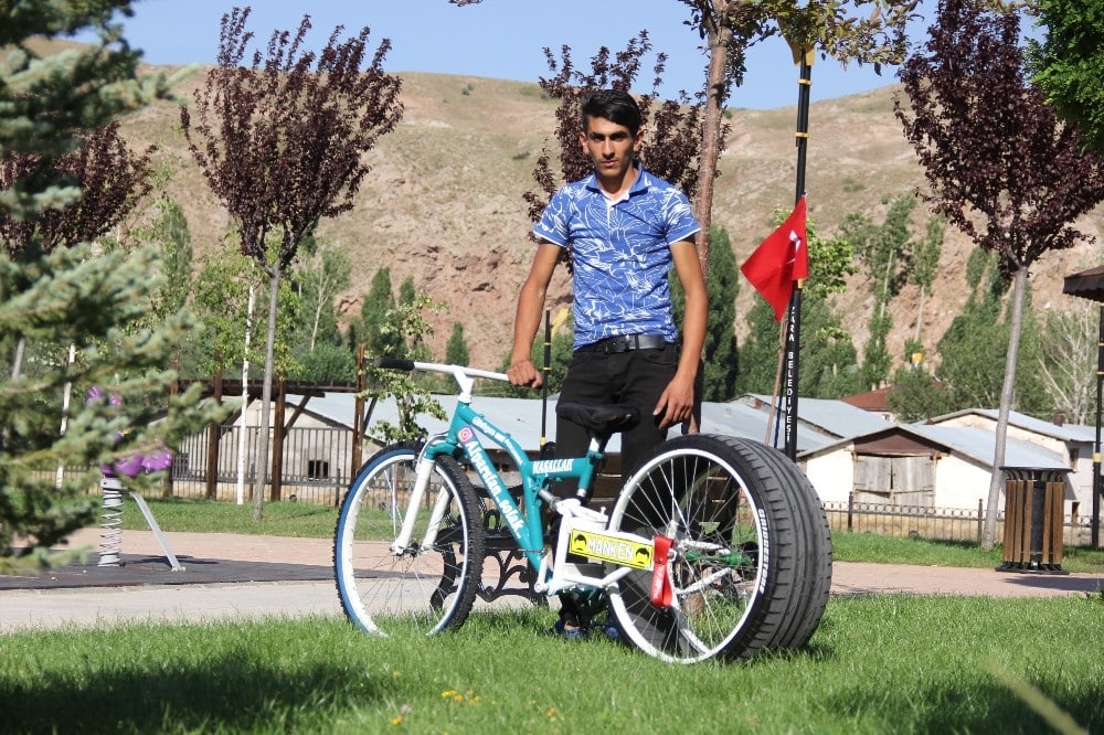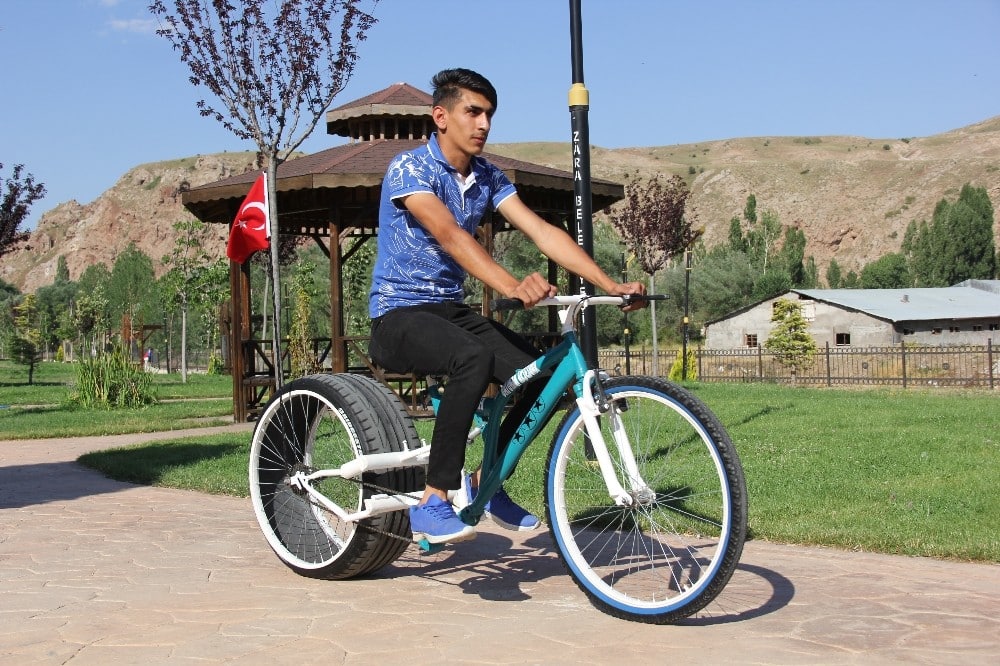Zara ilçesinde yaşayan 18 yaşındaki bir genç, bisikletini otomobil tekerleği takarak ilçedeki vatandaşların dikkatini çekmeyi başardı.