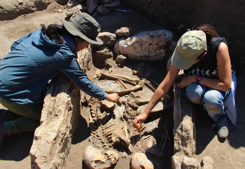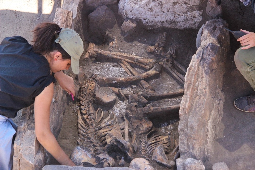 Hacettepe Üniversitesi Antropoloji Bölümü Öğretim Üyesi Prof. Dr. Yılmaz Selim Erdal ise mezarlardaki kişilerin akraba olup olmadıklarını DNA analizleriyle çözümlemeye çalıştıklarını ifade etti. Mezarla ilgili bilgi veren Erdal, “Birçok mezarımız var. Küçük sanduka mezarlar var ama bunların arasında en sıra dışı olan taş sanduka mezar. Bu mezarın üst kısmında bir çocuğa ait dağılmış bir iskelet bulduk. Kalıntıları kaldırdıktan sonra alttaki alanı kazdık ve burada aynı anda mezara yatırılmış 2 tane iskeletle karşılaştık. Bu iskeletlerden bir tanesi yeni yetme diyebileceğimiz 13-14 yaşlarında bir çocuğa ait ve bu çocuğun kafatasının üzerinde derin bir yara izi söz konusu. Bu yara sonucunda kişi ölmüş hayatını kaybetmiş. Diğer iskelette 35-40 yaşlarında bir erkeğe ait oldukça güçlü ve kuvvetli bir bedensel yapıya sahip. Her ikisinin bu mezara gömülmesi belki de benzer bir olayla sonuçlanmış bir durumla ölmeleri nedeniyle yapılmış olmalı. Aynı anda gömüler genellikle benzer bir şekilde hayatlarını kaybetmelerinin bir sonucu olabiliyor. Mezara ölüleri gömerken kireçler var. Önce mezarı kireçle kaplamışlar daha sonra dokumayla tamamlamışlar yapının üzerini. Sonra ölüleri yatırmışlar ve üzerini kapatmışlar. Bizim şu andaki hedefimiz birbirine benzeyen mezar tipleri, mezar grupları, aynı mezarda gömülü olan insanların akraba olup olmadıklarını antik DNA analizleriyle çözümlemeye çalışıyoruz. Bu sene bir başlangıç oldu. Önümüzdeki yıldan itibaren buna yönelik çalışmalarımızı tamamlayacağız. Böylece en azından buraya gömülü olan insanların nasıl akrabalık ilişkisine sahip bunları araştırarak Anadolu’nun popülasyon tarihine önemli katkılar sağlayacağımızı düşünüyoruz” ifadelerini kullandı.