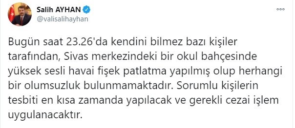 Vatandaşların tedirginliği üzerine Sivas valisi Salih Ayhan sosyal medya üzerinden bir açıklama yaparak kendini bilmez kimselerin bu gök bombasını patlattıklarını, herhangi bir olumsuzluk söz konusu olmadığını ve kişiler hakkında adli/idari her türlü işlemin yapılacağını bildirdi.
