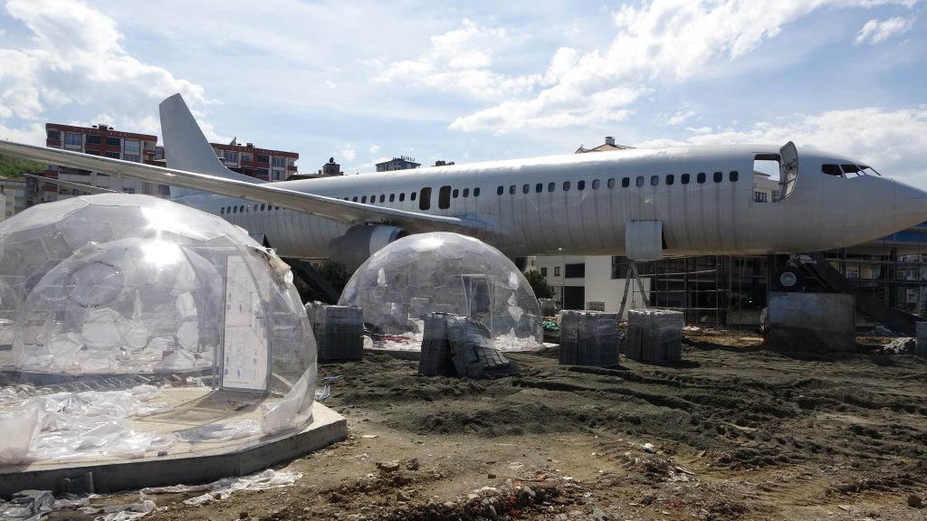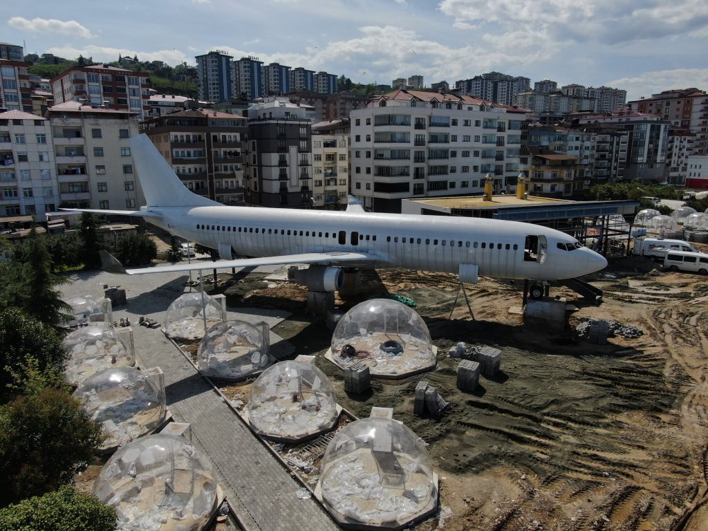 Trabzon’da ve Karadeniz bölgesinde çok yaygın değil ancak Türkiye genelinde yaygın. Bir yenilik olsun insanlar ailesiyle birlikte gelsin hem yemeğini yesin toplantısını yapsın o şekilde düşündük. Uçağımızın yanında fırınlarımızın bulunduğu binamız var orada bir salonumuz olacak fırınlarımızı bitirdik. Uçağın içerisinde aynı anda 40-50 kişi yemek yiyebilecek tesislerimizle birlikte toplam kapasitesi yaklaşık 400 kişilik. Uçağımızın içerisine fırın olması, dolayısıyla ruhsat alma şansımız yok. Bunları düşündük ancak olma şansı yok. 3-4 arkadaş biraya gelerek birbirimize destek olduk tek başına yapılacak bir tesis değil. Şu ana kadar çok yol kat ettiğimizi düşünüyorum” dedi.