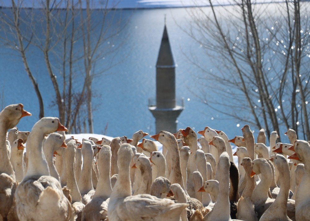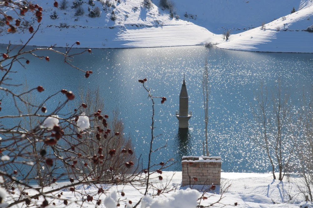 Pusat-Özen barajının ortasındaki minare havadan görüntülendi
