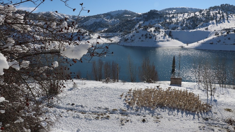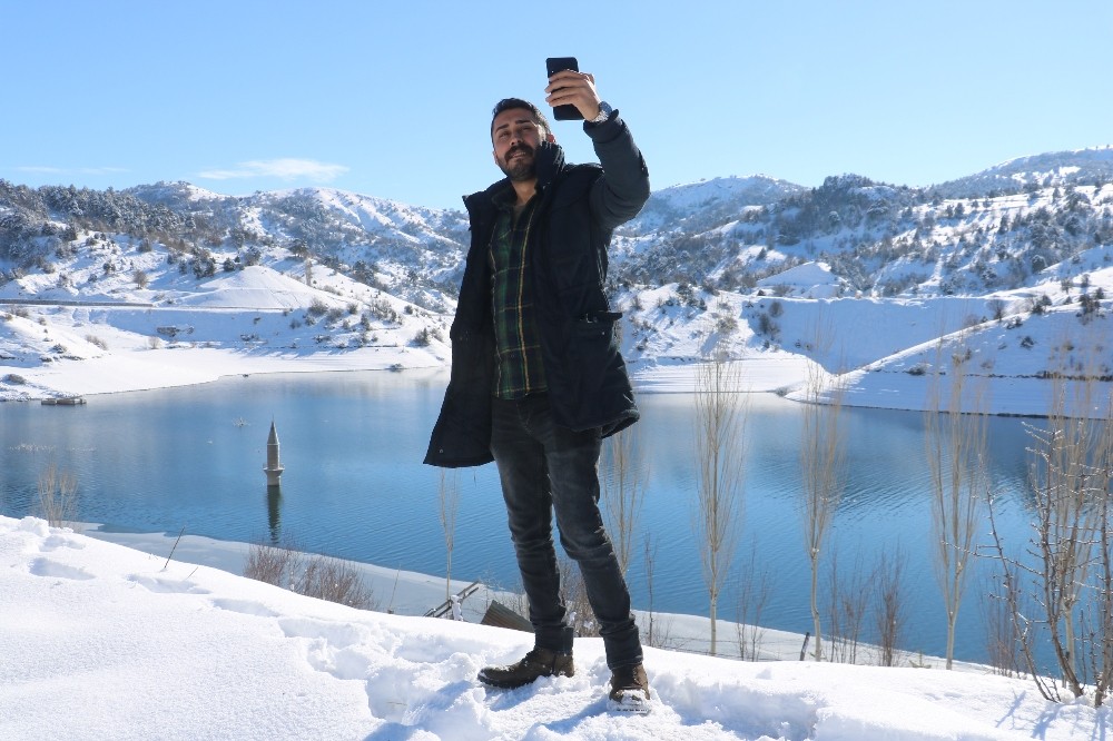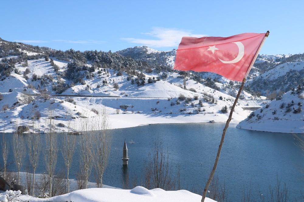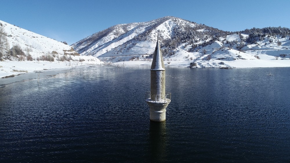 Sivas’a bağlı Hafik ilçesinde bulunan Pusat-Özen barajının su tutması ile birlikte baraj ortasındaki minare de sular altında kalmıştı. Sivas genelinde etkili olan kar yağışı tüm Sivas’a bembeyaz gelinliği tekrar giydirirken baraj ortasındaki minarenin karlı görüntüsü de bir hayli dikkat çekti. Drone ile gökyüzünden görüntülenen kar kaplı minare muhteşem bir görsel ortaya çıkarırken barajın görüntüsü de görenleri adeta büyüledi.
