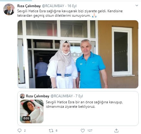 Hatice Esra Boyraz ile çekildiği bir fotoğrafı paylaşan Rıza Çalımbay, Hatice Esra’nın sağlığına kavuşarak kendilerini ziyarete geldiğini belirterek, kendisine geçmiş olsun dileklerini iletti.
