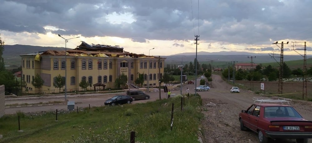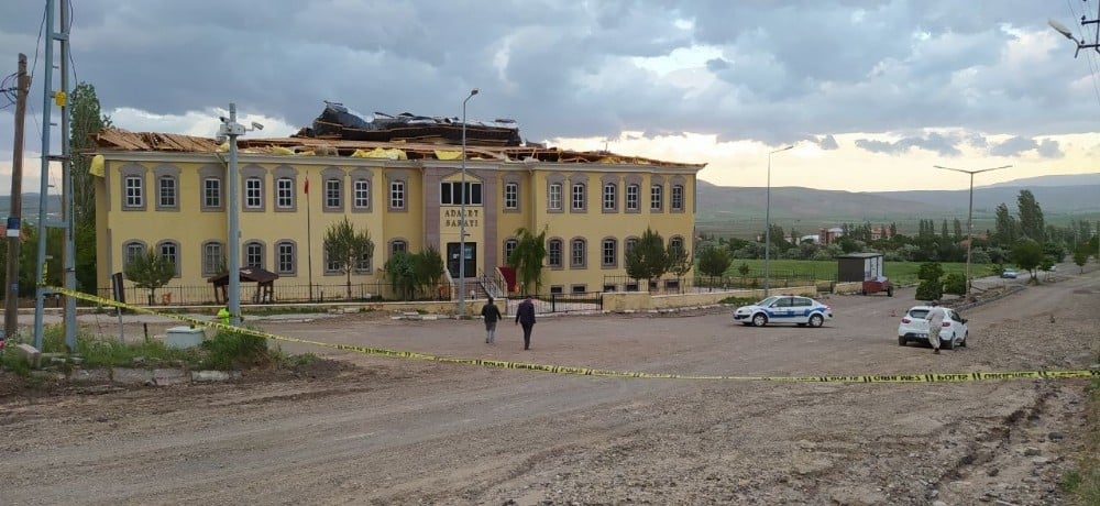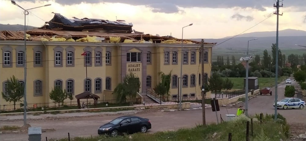 Gemerek Adalet Sarayı’nın çatısının kullanılamaz hale geldiği görüldü. Bölgeye gelen polis ekipleri çatının geri kalan bölümünün uçarak tehlike oluşturmaması adına geniş bir alanı giriş ve çıkışa kapatarak bölgede tedbir aldı.