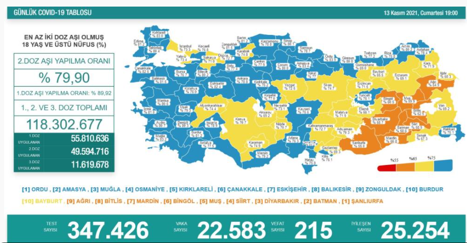 Sağlık Bakanlığı tarafından Türkiye’nin yeni korona virüs tablosu açıklandı. 13 Kasım’da açıklanan 24 saatlik verilere göre 22 bin 583 vaka tespit edildi. Virüs nedeniyle hayatını kaybedenlerin sayısı 215 oldu. Bir günde toplam 347 bin 426 test yapılırken, iyileşen hasta sayısı 25 bin 254 olarak kaydedildi. Sağlık Bakanlığı tarafından açıklanan tabloda, 2 doz aşılama verilerine de yer verildi. En az 2 doz aşı olmuş 18 yaş üzeri nüfusu kapsayan verilere göre Türkiye’de 2. doz aşılama ortalama yüzde 79,90 oldu. 1. doz ortalaması yüzde 89,92 olurken, 1., 2. ve 3. doz aşısını olan vatandaş sayısı toplamda 118 milyon 302 bin 677 ‘e yükseldi.