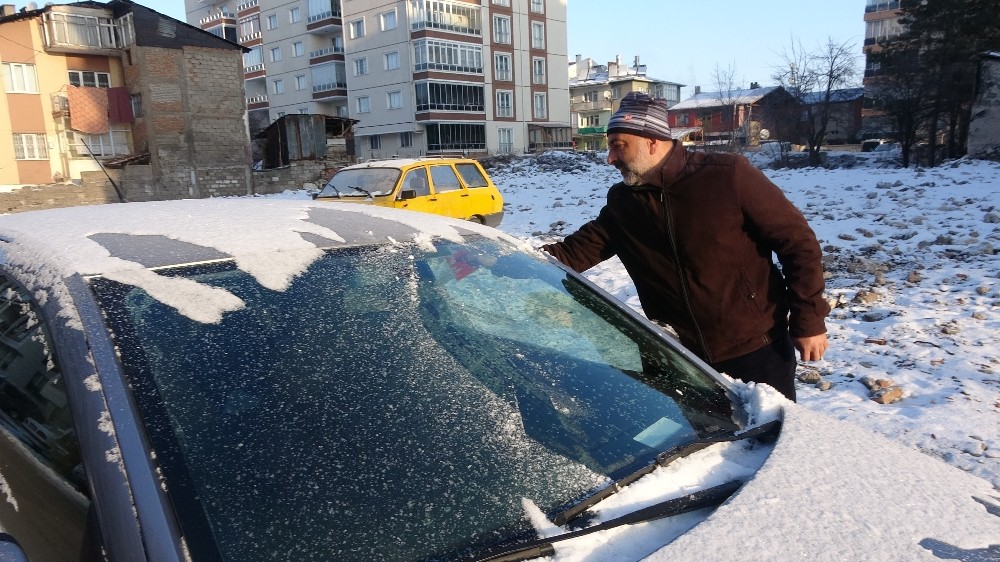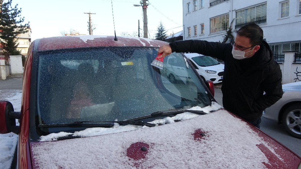 Sabah saatlerinde işe gitmek için evlerinden çıkan vatandaşlar uzun bir süre araçlarındaki buzu temizlemek için çaba sarf etti.