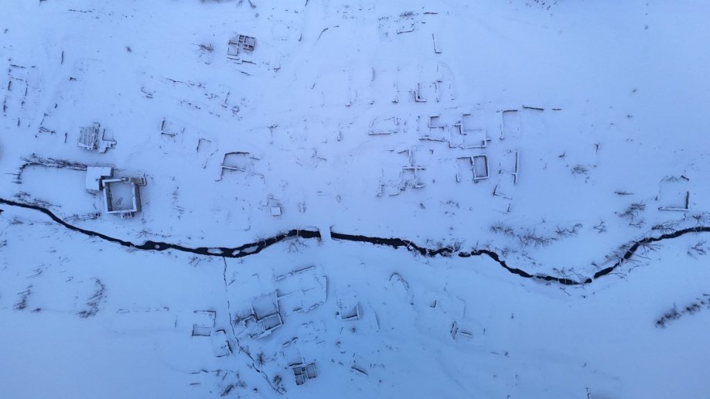 Yoğun kar yağışının ardından kar altında kalan eski köy ve çevresi, drone yardımıyla havadan çekilen görüntülerle belgelendi, bu eşsiz manzara adeta bir zaman yolculuğu sunar nitelikte.