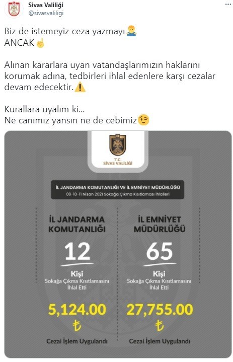 Valiliğin sosyal medya hesaplarından yaptığı açıklamada kısıtlama tedbirine uymayan Sivaslı vatandaşlara kesilen cezalar ile ilgili bilgilendirmeler yapıldı. Yapılan açıklamaya göre geçtiğimiz hafta polis ekipleri tarafından 65 ve jandarma ekipleri tarafından 12 kişi olmak üzere toplam 77 vatandaşa sokağa çıkma tedbirlerine uymadığı için ceza kesildiği ifade edildi. Kesilen cezaların toplamının ise 32 bin TL’den fazla olduğu öğrenildi.