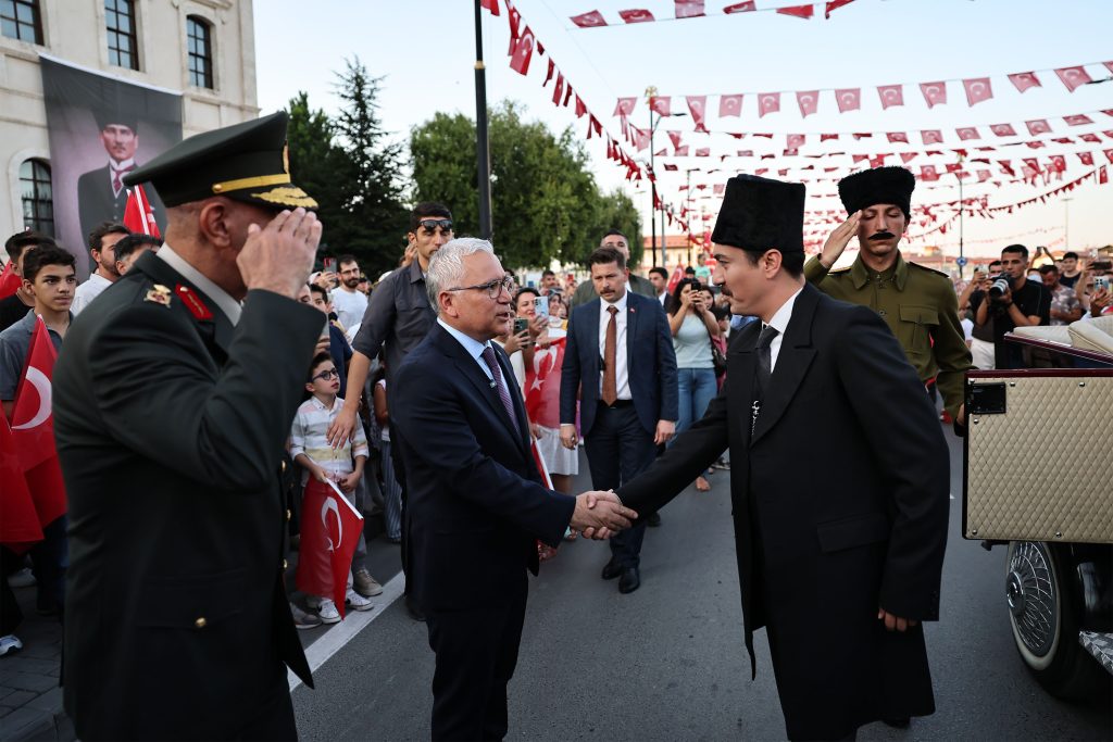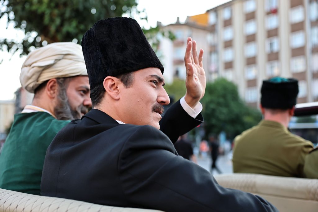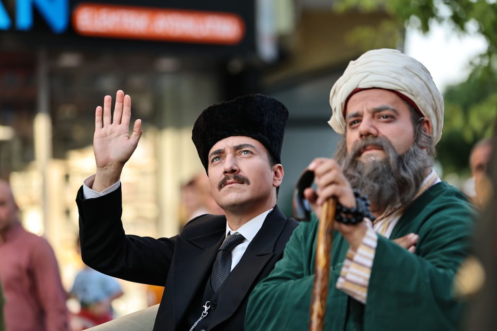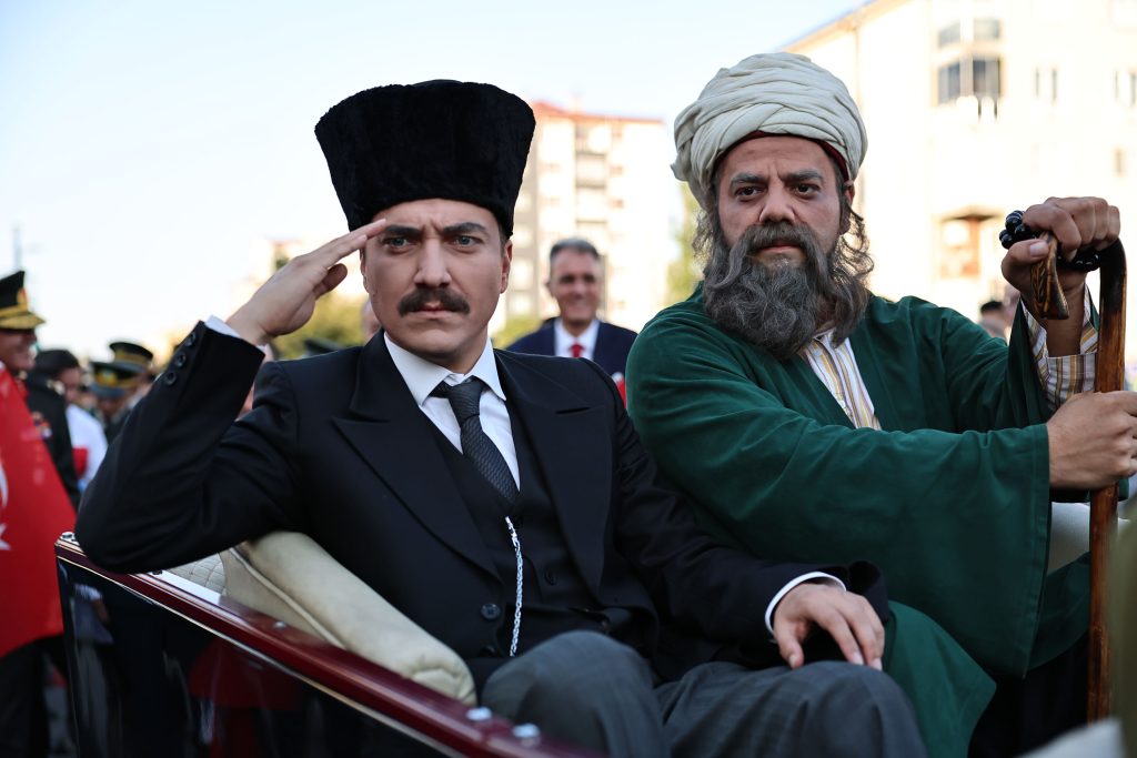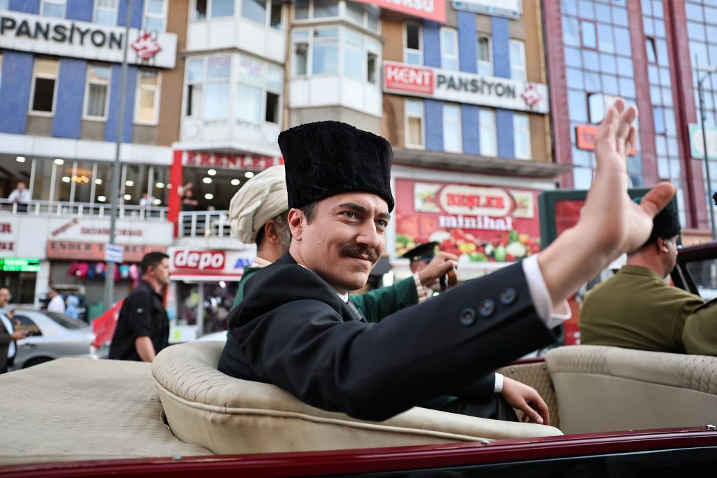 Ulu Önder Mustafa Kemal Atatürk’ü canlandıran Devlet Tiyatrosu oyuncusu Abdülsamet Sünbül, üstü açık arabayla güzergâh boyunca halkı selamladı.
