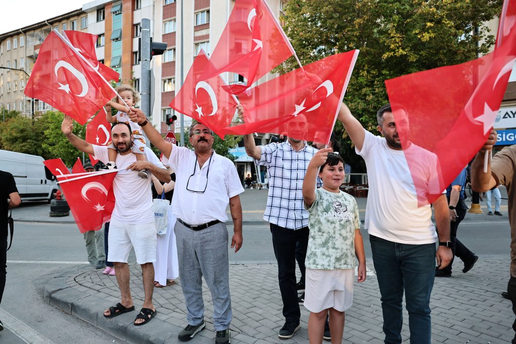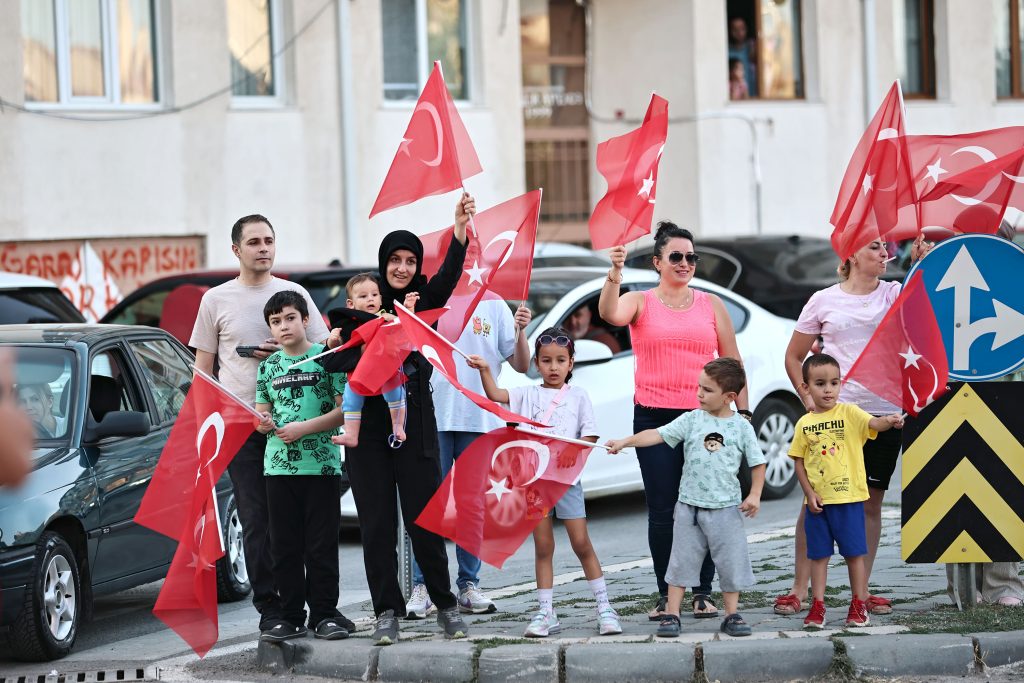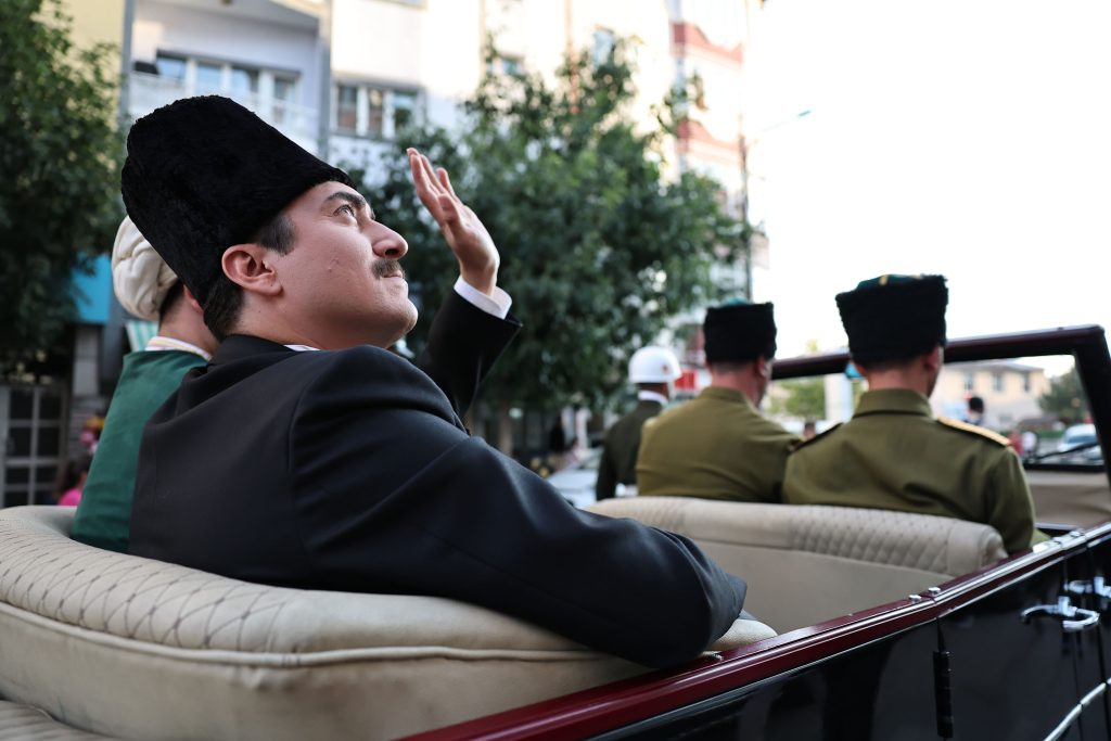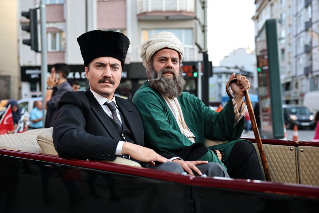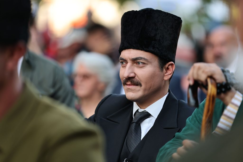 Ulu Önder Mustafa Kemal Atatürk’ü canlandıran Devlet Tiyatrosu oyuncusu Abdülsamet Sünbül, üstü açık arabayla güzergâh boyunca halkı selamladı.