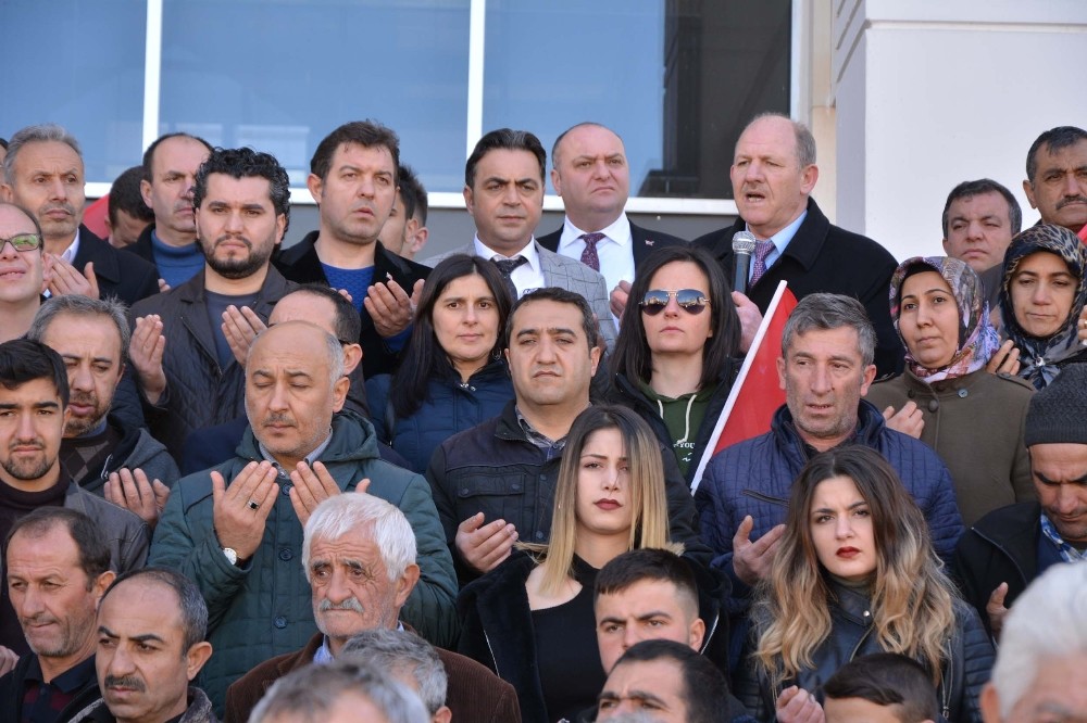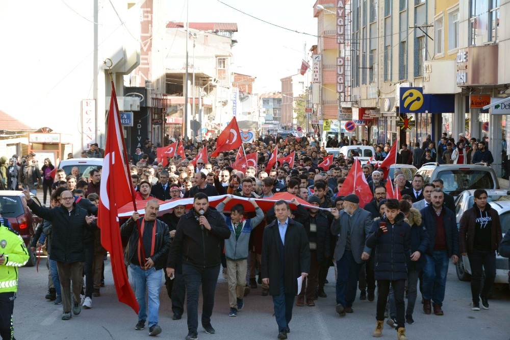 İlçe Belediye binasının önünde toplanan vatandaşlar ellerinde Türk bayrakları, dillerinde şehitlerimiz için anlamlı sloganlarla Hükümet konağına kadar yürüdü. Yürüyüş esnasında vatandaşlar sıkça tekbir getirdi. “Şehitler ölmez, vatan bölünmez” sloganını defalarca dile getiren vatandaşların Hükümet konağına varmasını müteakip Kur’an-ı Kerim okundu.