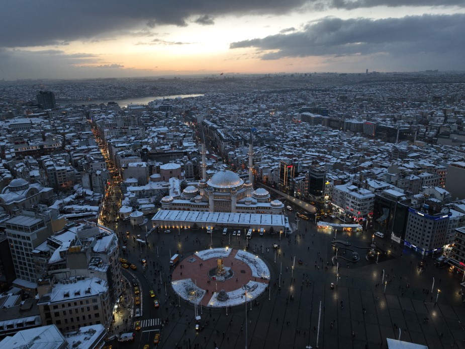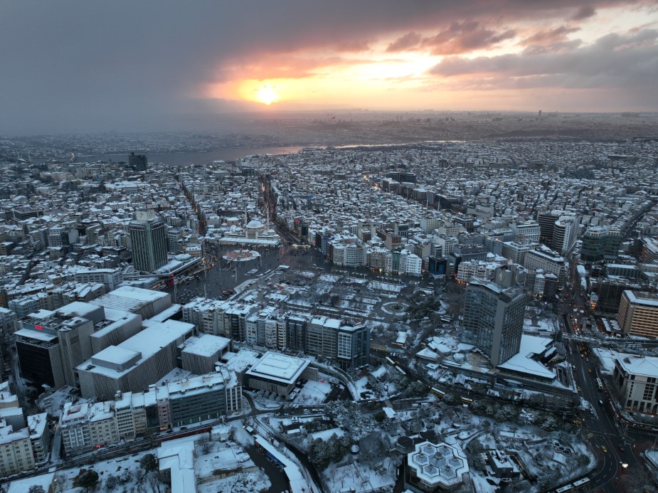 İstanbul’un kalbi Taksim Meydanı, İstiklal Caddesi ve çevresi, kar yağışı altında adeta bir kartpostal gibi görüntüler sergiledi. Gün batımı sırasında gökyüzü kızıl tonlarına büründü ve bu sırada devam eden kar fırtınası, şehri eşsiz bir manzaraya soktu.