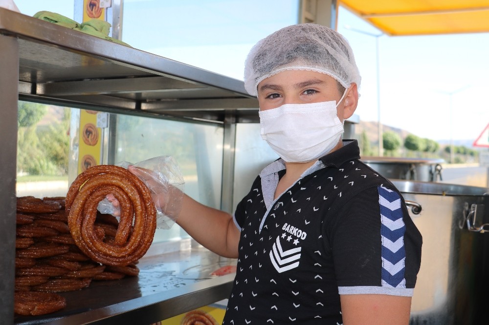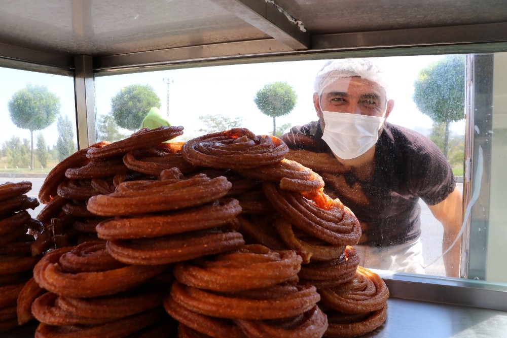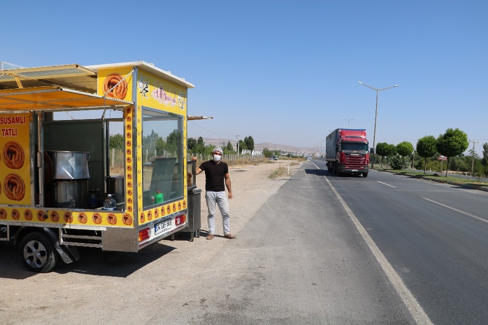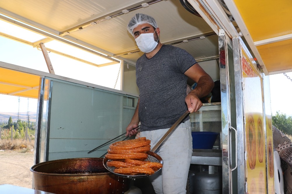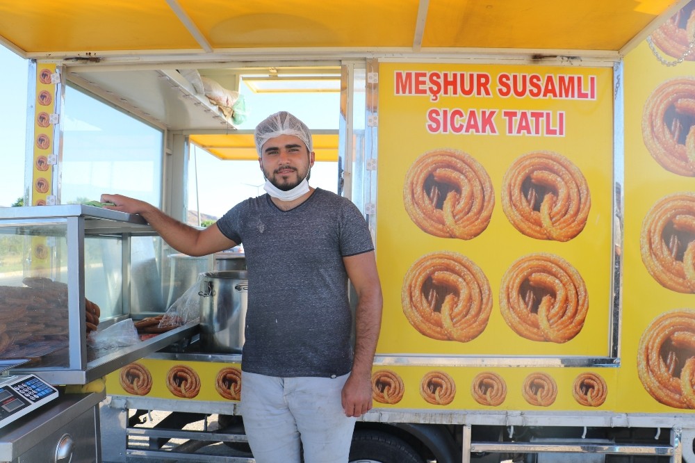 Bir arkadaşının kendisine tavsiyesi üzerine arabasıyla Şanlıurfa’dan Sivas’a gelerek tatlıcılık yapmaya başlayan genç günde 45 kilo civarında tatlı satışı yapıyor.