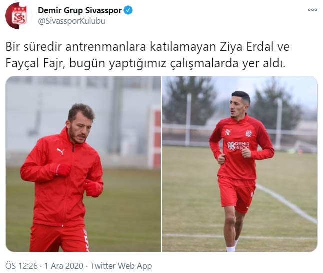 DG Sivasspor’da korona virüs vakaları devam ederken bir yandan da tedavisi tamamlanıp takıma dönen futbolcular yüzleri güldürüyor. Daha önce Covid-19 testi pozitif çıkan ve karantinaya giren tecrübeli oyuncular Fayçal Fajr ve kaptan Ziya Erdal’ın negatif çıkan testlerinden sonra karantinadan çıktıkları bildirildi. Takımla birlikte idmanlara başlayan futbolcular düz koşular yaparak çalışmalarına devam ediyorlar. Tecrübeli oyuncuların sağlık durumu ile ilgili son detaylar takımın resmi sosyal medya hesaplarından da paylaşılırken Fayçal’ın ve Ziya’nın takıma dönmelerinden dolayı mutlu oldukları gözlemlendi.